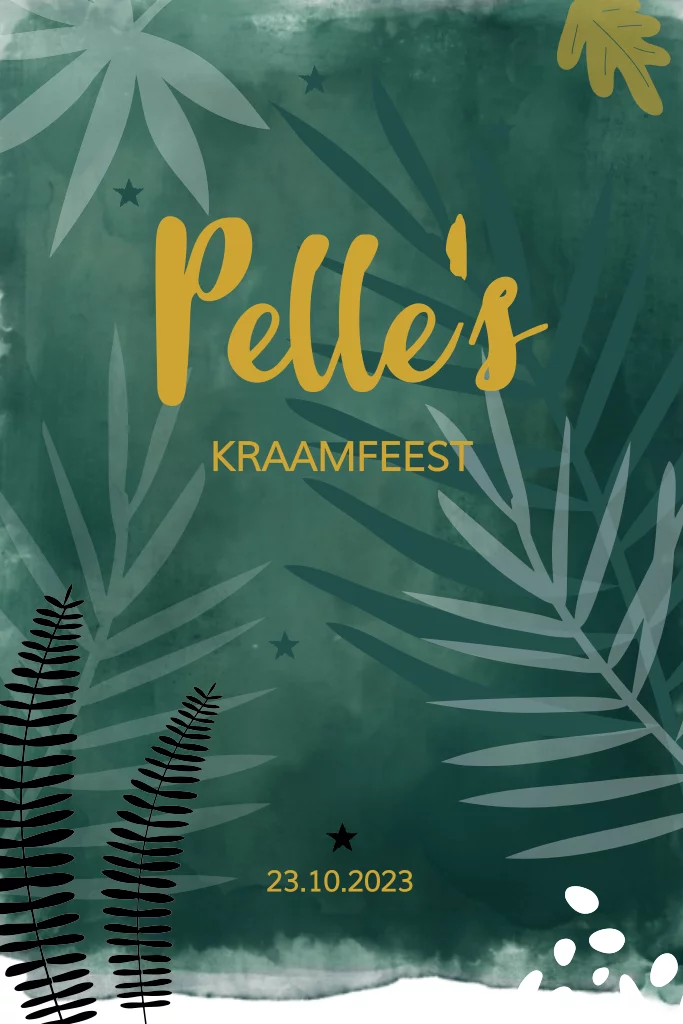 Uniek en trendy full colour uitnodiging voor ee nkraamfeest! Met prachtige donkergroene watercolor op de ondergrond en jungle bladeren. Alles staat los en is zelf te bewerken.
