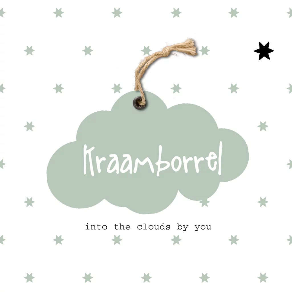 Stijlvol grijs groen kraamborrelkaartje met wolkje? Die past bij je geboortekaartje met sterren patroon, grijs groene wolk met koortje. Alles is te bewerken!