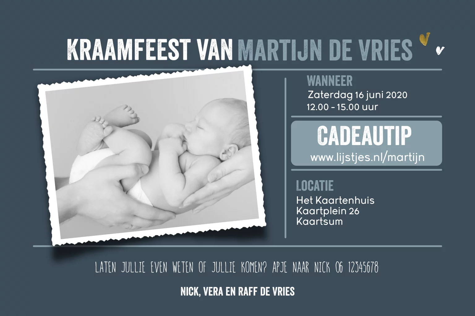 Stoere uitnodiging kraamfeest met eigen foto en vlakverdeling