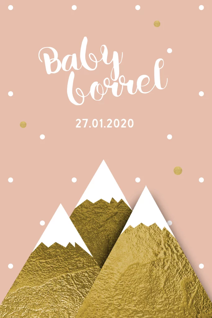 Staande frisse uitnodiging poppeslok-babyborrel met stippen, bergen in goudlook in de kleur taupe roze voor een meisje. Versierd met goudkleurige confetti, geen echt goud, zelf op te maken!