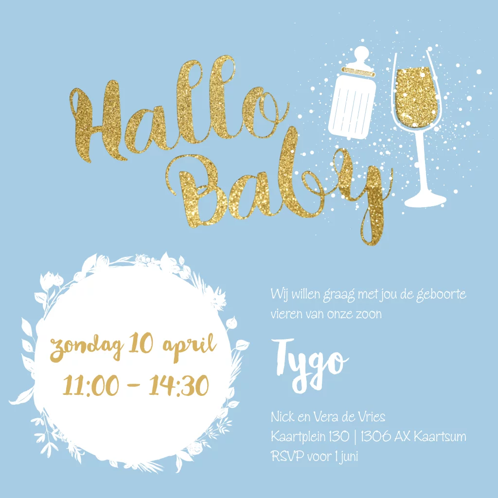 Lieve uitnodiging voor je baby zoon kraamborrel feest. Met pastel blauw en goud gekleurde tekst 'hallo baby' en tekening champagne glas met baby flesje.