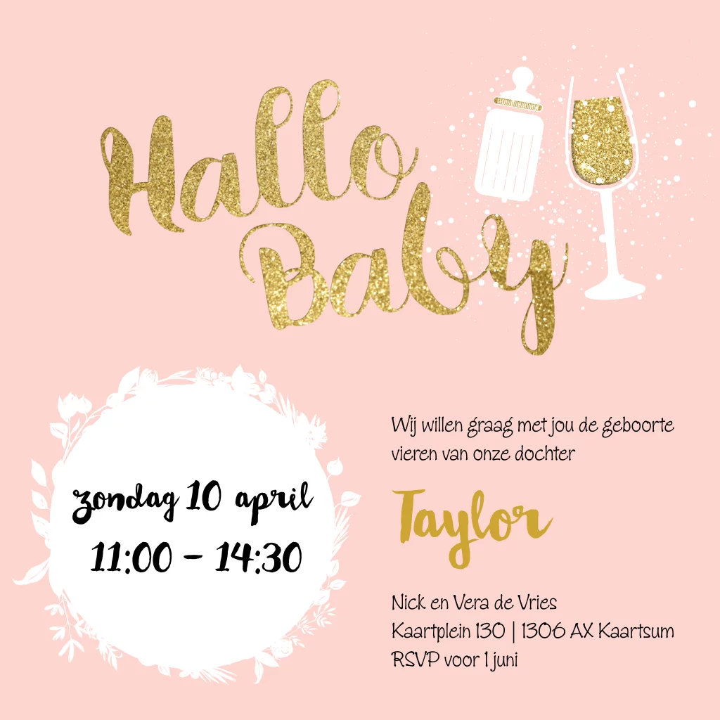Hippe uitnodiging voor je baby dochter kraamborrel feest. Met pastel roze kleur en goud gekleurde tekst 'hallo baby' en tekening champagne glas met baby flesje.