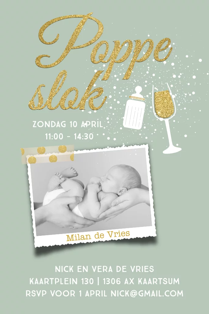 Lieve uitnodiging voor je baby zoon kraamborrel/poppeslok feest. Met grijs groen en goud gekleurde tekst 'poppeslok' en champagne glas met baby flesje. Fotokader voor eigen foto. Alles staat los en is te verplaatsen of om te kleuren.