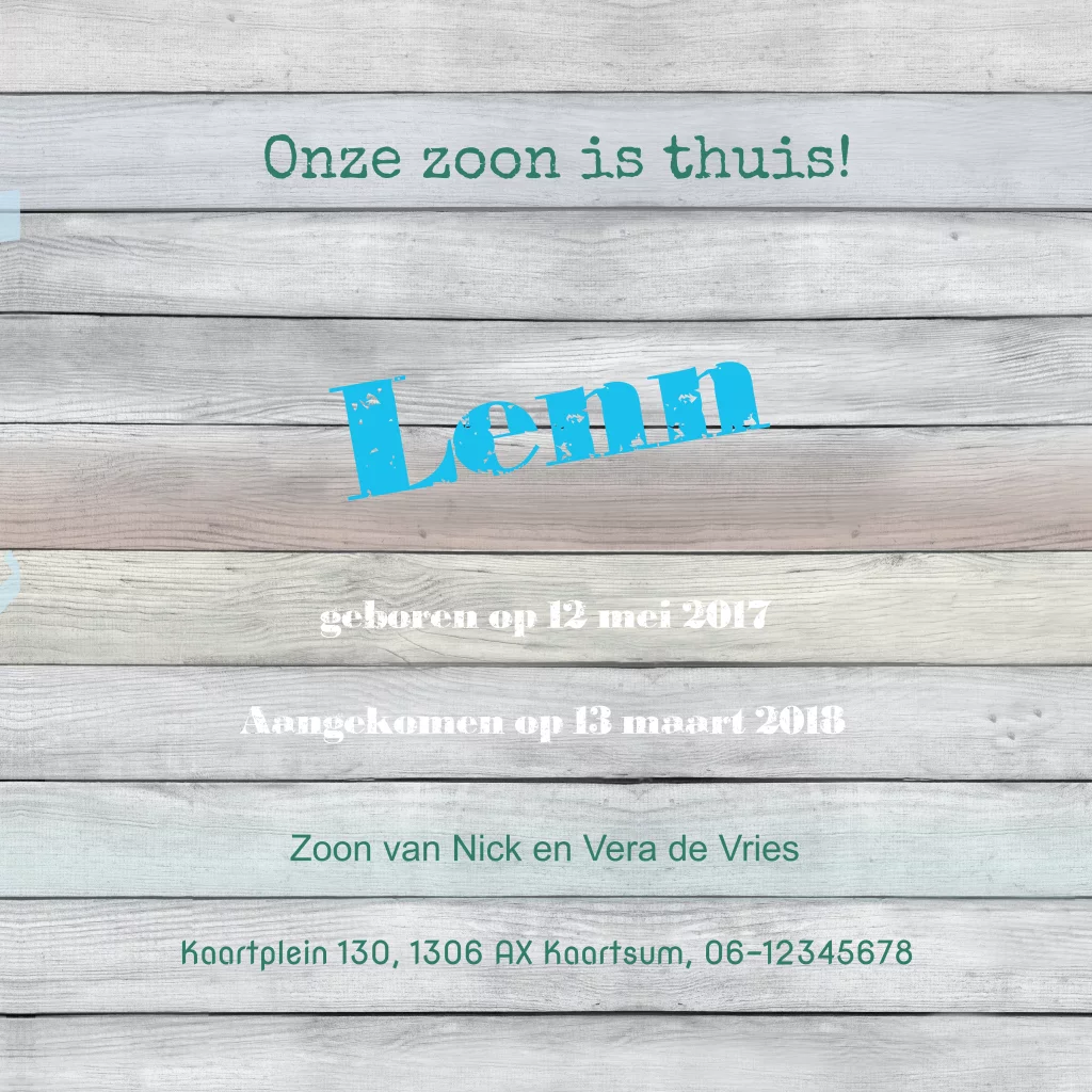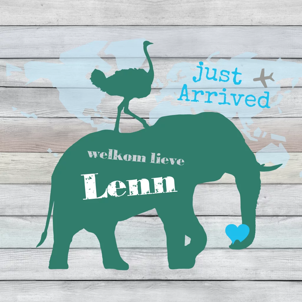 Stoer en lief aankomstkaartje voor een jongen? Met hout print, wereld en exotische dieren, zoals olifant. Binnenzijde heeft Hollandse dieren!
