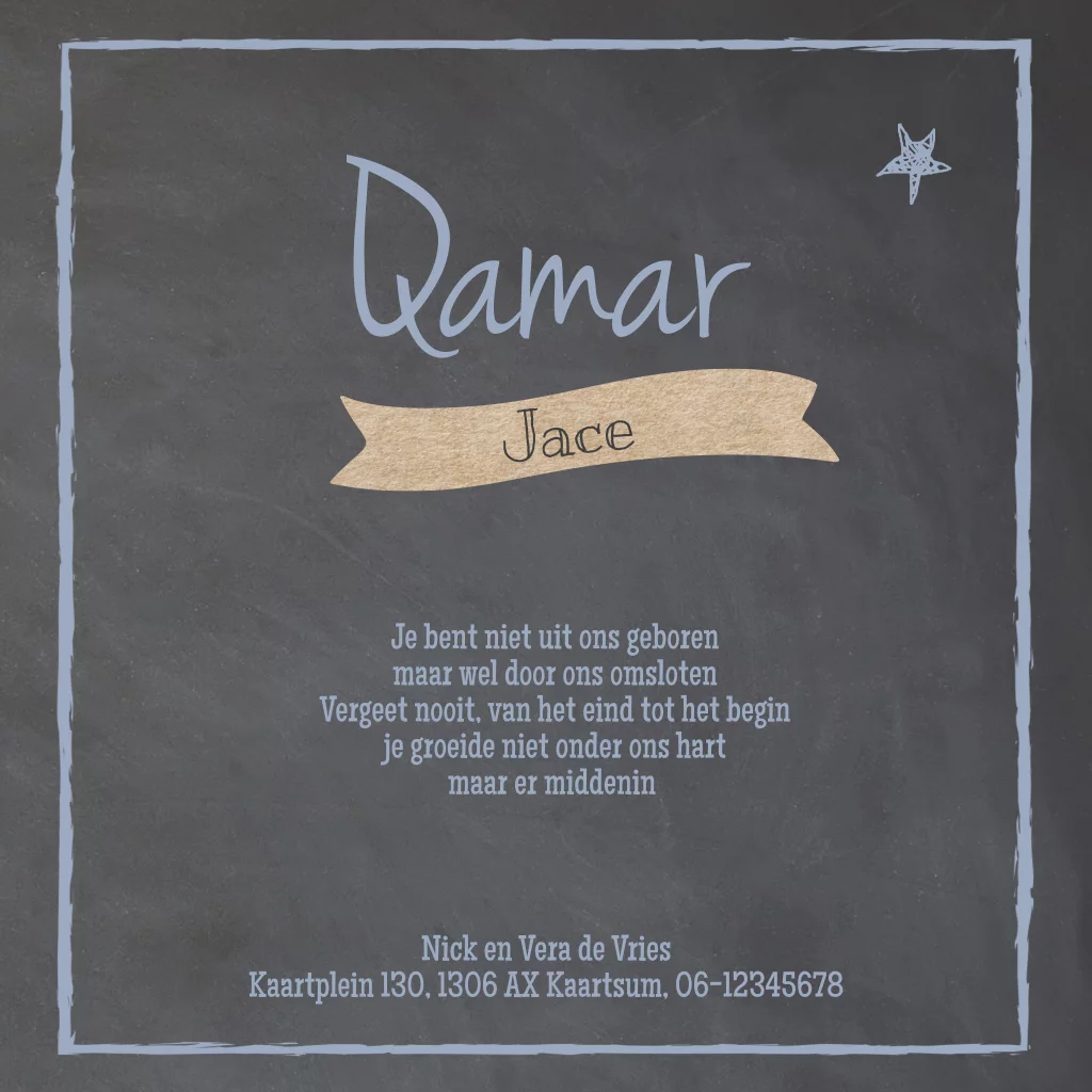 Hip aankomstkaartje voor een jongen met krijtbord print en kader rondom. Met stempel kraft slinger en speelse sterren. Alles staat los en is te bewerken!