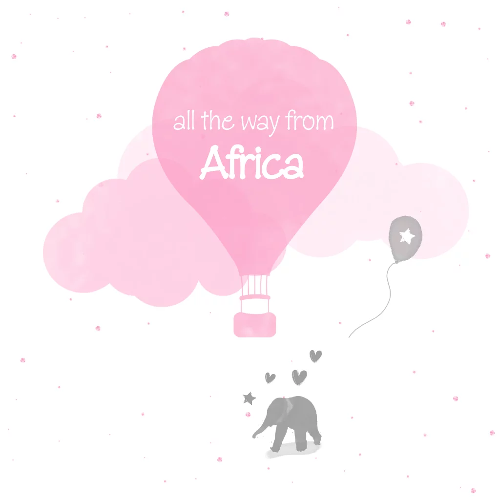 Hip aankomstkaartje voor adoptiekindje met olifantje en een luchtballon tussen de wolken. In getekende stijl. Alles staat los en is aan te passen en om te kleuren.