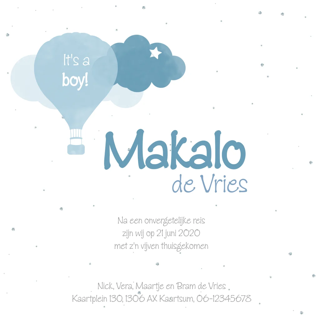 Hip aankomstkaartje voor adoptiebroertje met olifantje en een luchtballon tussen de wolken. In getekende stijl. Alles staat los en is aan te passen en om te kleuren.