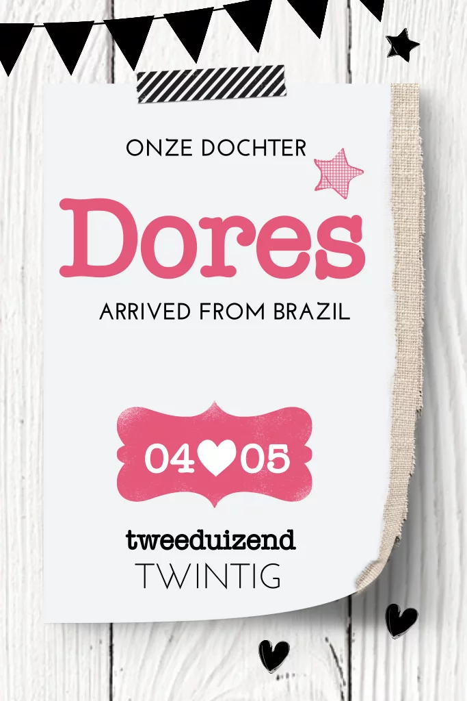 Modern enkel adoptiekaartje voor adoptie meisje met jutte kader en wit hout.
