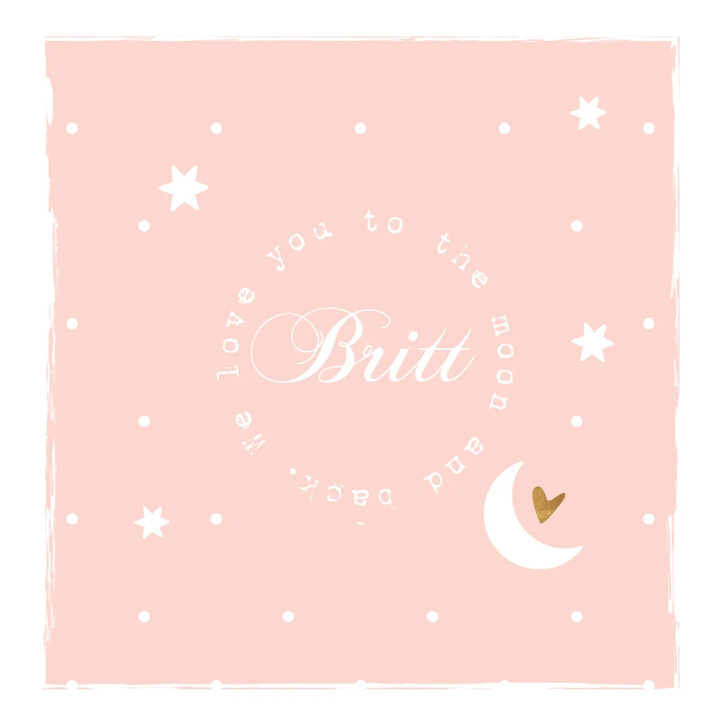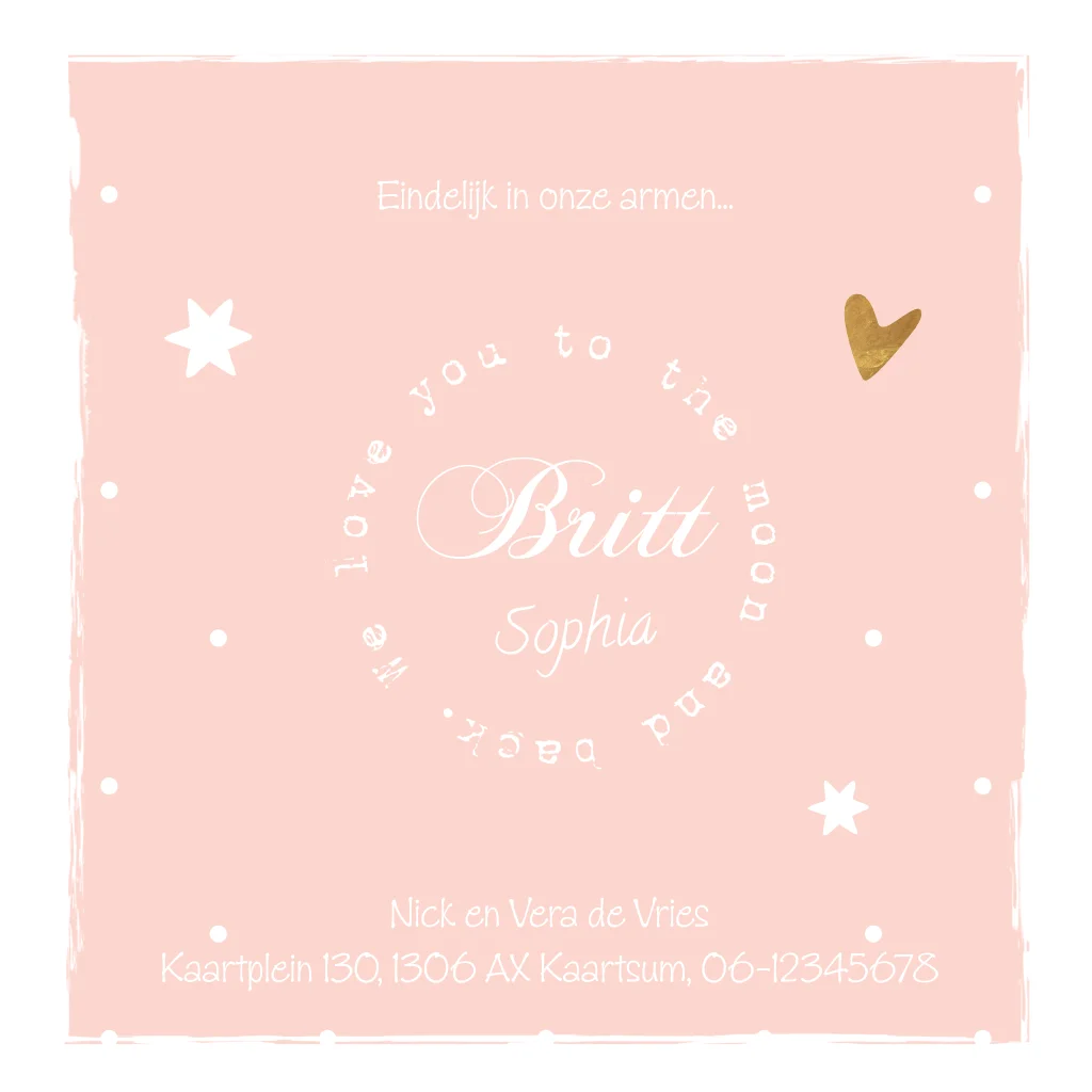 Lief aankomstkaartje voor adoptiekindje met stempel 'We love you to the moon and back', stippen patroon, sterren en koper kleurige hartjes. Alles staat los op dit geboortekaartje en is aan te passen!