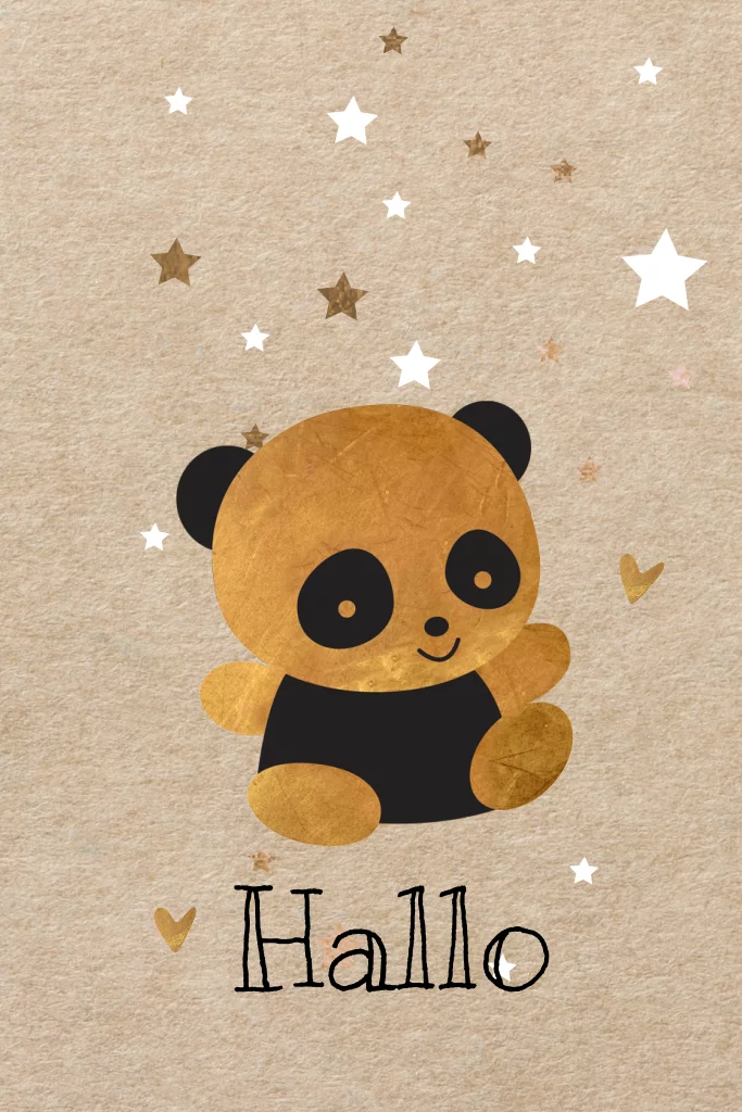 Hip enkel kraft look aankomstkaartje voor een adoptie meisje met kader, pandabeer en speels vallende sterren in wit en koper kleur. Alles staat los en is te bewerken.