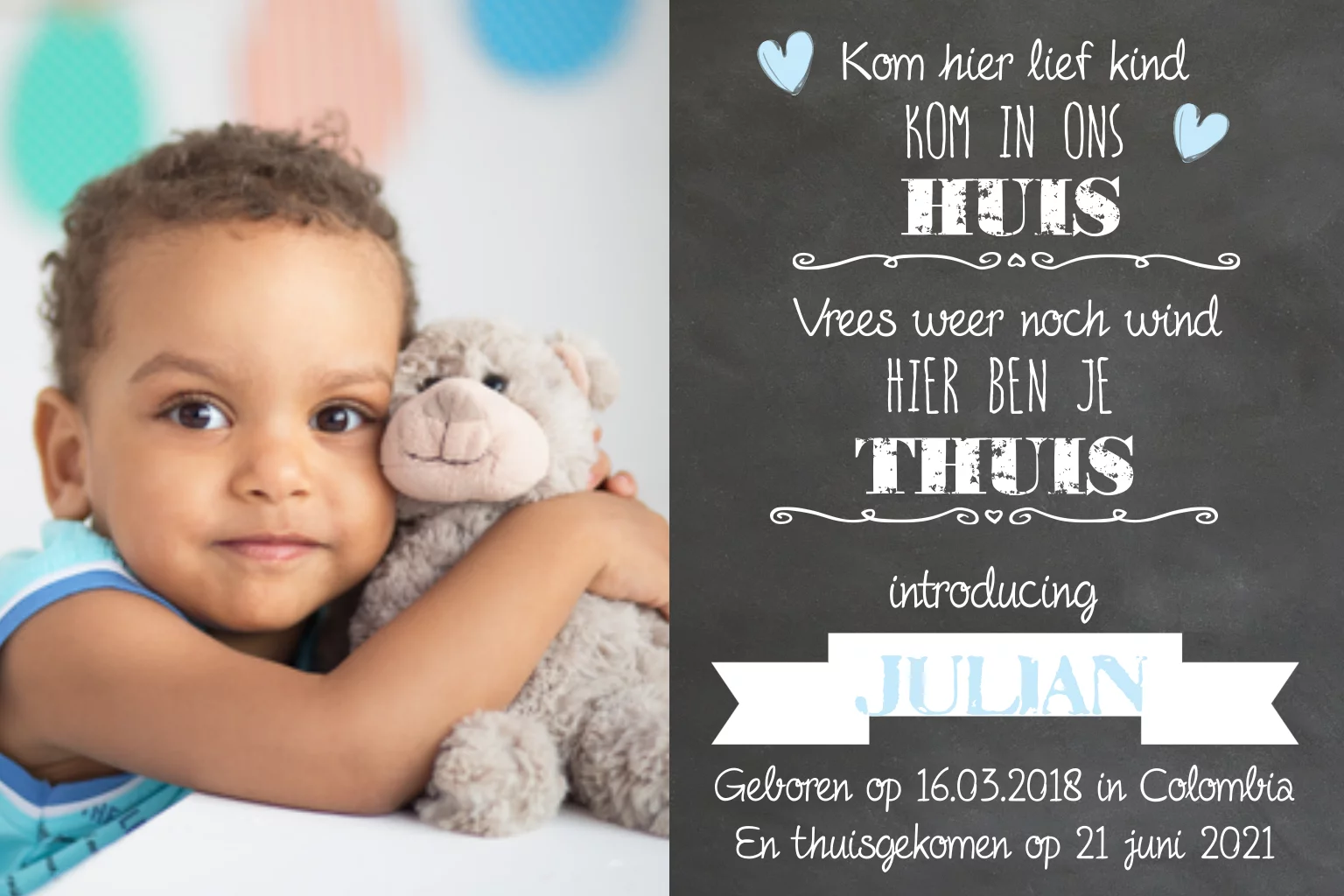 Stoer enkel aankomstkaartje voor adoptie jongen in krijtbord en barok stijl. Kaart zelf maken!