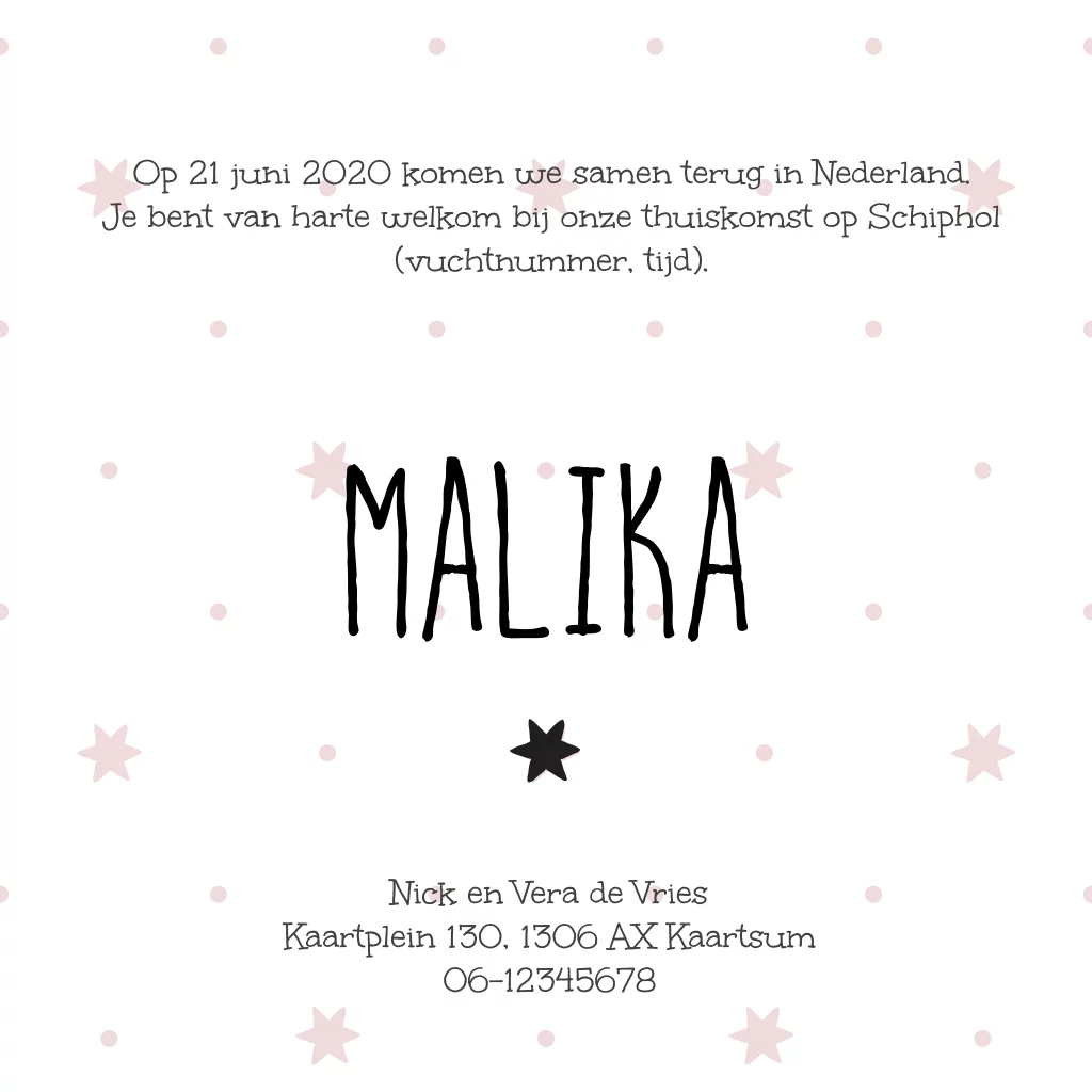 Lief aankomstkaartje voor adoptie kindje met sterren en stippen patroon. In het zwart wit met roze. Versierd met kraft look labeltje met nietje en de wereld kaart. Alles staat los op dit geboortekaartje en is aan te passen!