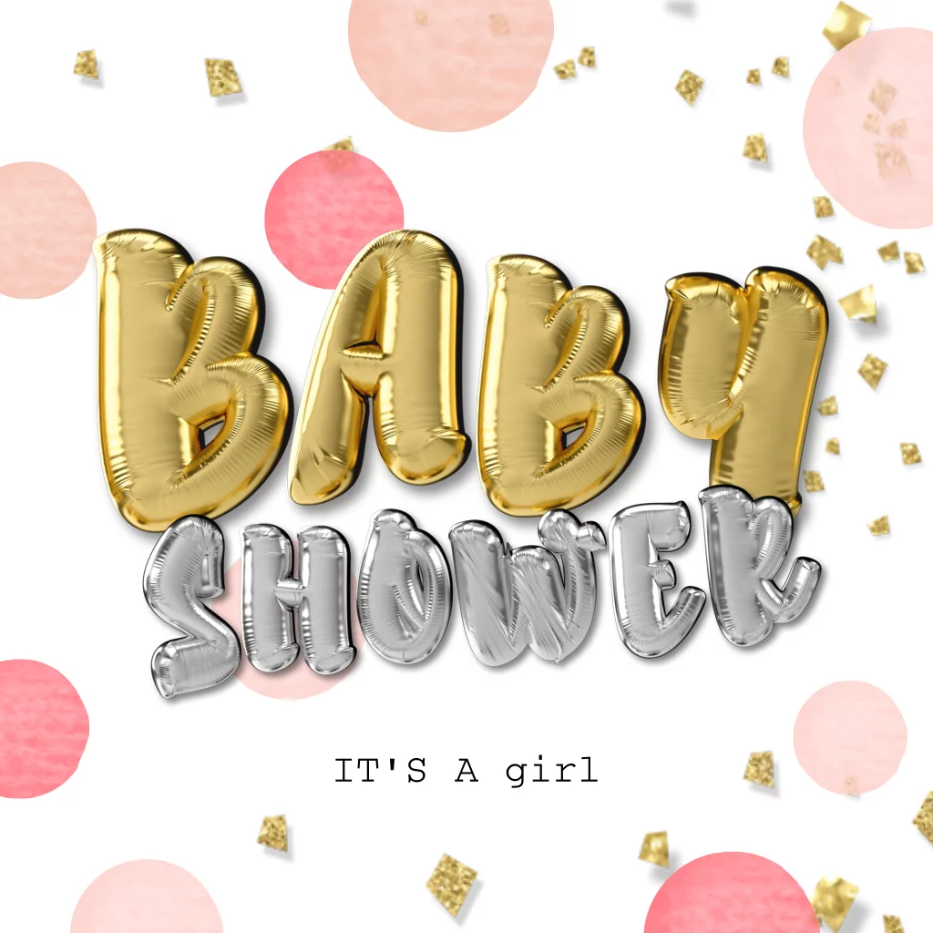 Eerdaags een babyshower feest organiseren? Feestelijke enkele uitnodiging met goud look confetti en roze tinten! Hippe folie ballonnen in goud en zilver kleur. Met een baby voorspelling die je kan invullen! Zelf maken!
