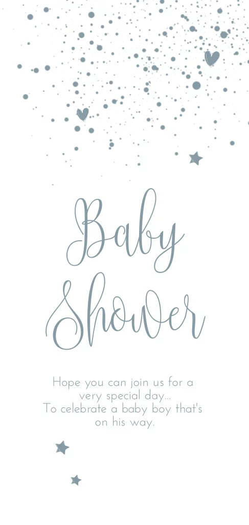 Helemaal een trend van nu! Een extra lang babyshower kaartje. Met sterren, spetters in een grijs blauwe kleur voor een jongen.
