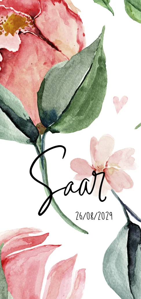 Hip langwerpig staand geboortekaartje voor een meisje! Met drukke bloemen print in zacht roze kleur met rozen van watercolor. Zelf maken.