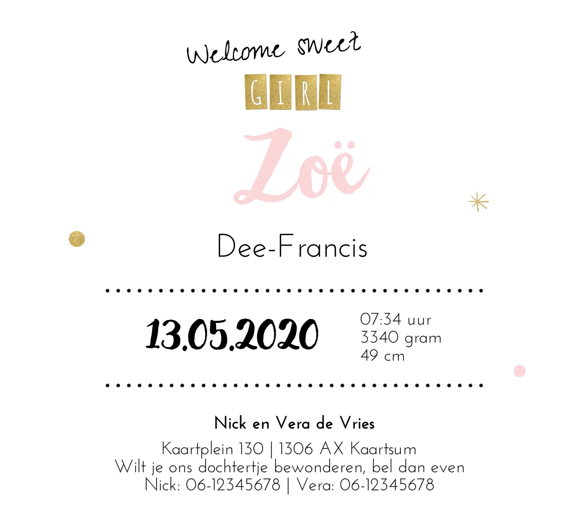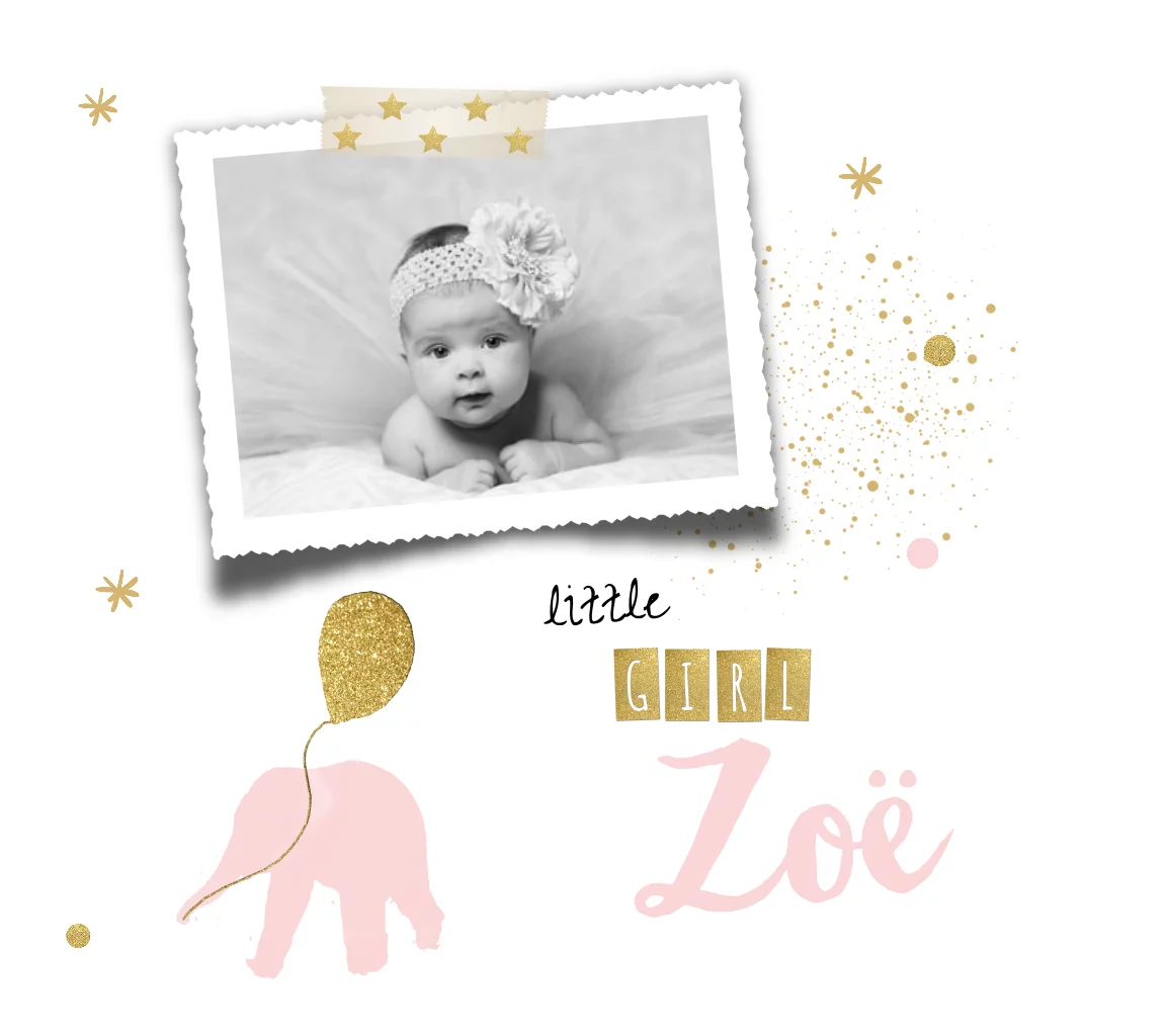 Hip foto geboortekaartje voor een meisje met lief olifantje en olifanten familie in Belgisch vierkant. Met goud look elementjes zoals; ballon, plakband, confetti en blokletters boy. Alles is zelf aanpassen! Ook de kleur!