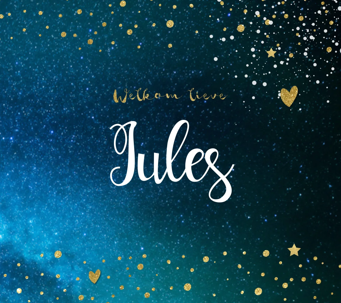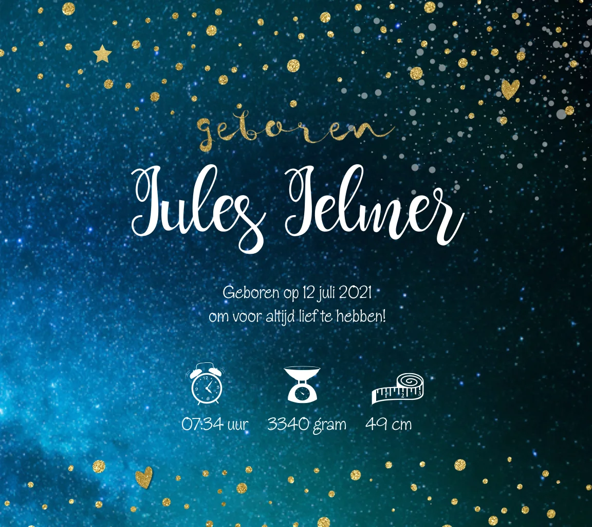 Chic geboortekaartje met donkerblauw spankelend heelal en goud glitter look? Voor een jongen met hartjes en glitter look confetti! Alles staat los op dit kaartje en is aan te passen! (goud is een look)