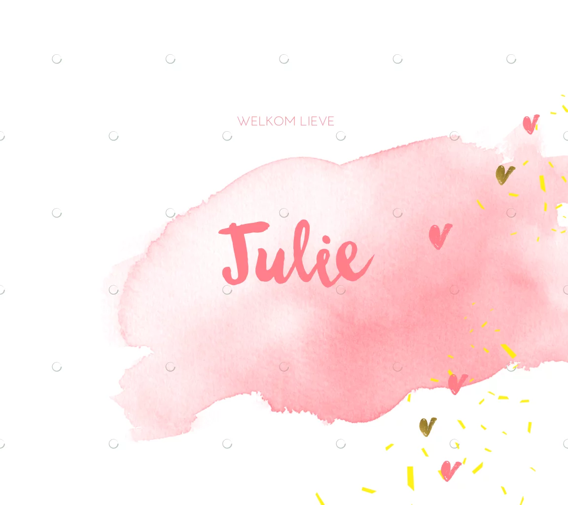 Speciaal Belgisch vierkant geboortekaartje voor een meisje! Met warm roze watercolor streep met stippen patroon en hartjes met goud folie en licht gele confetti snippers! Zelf maken!