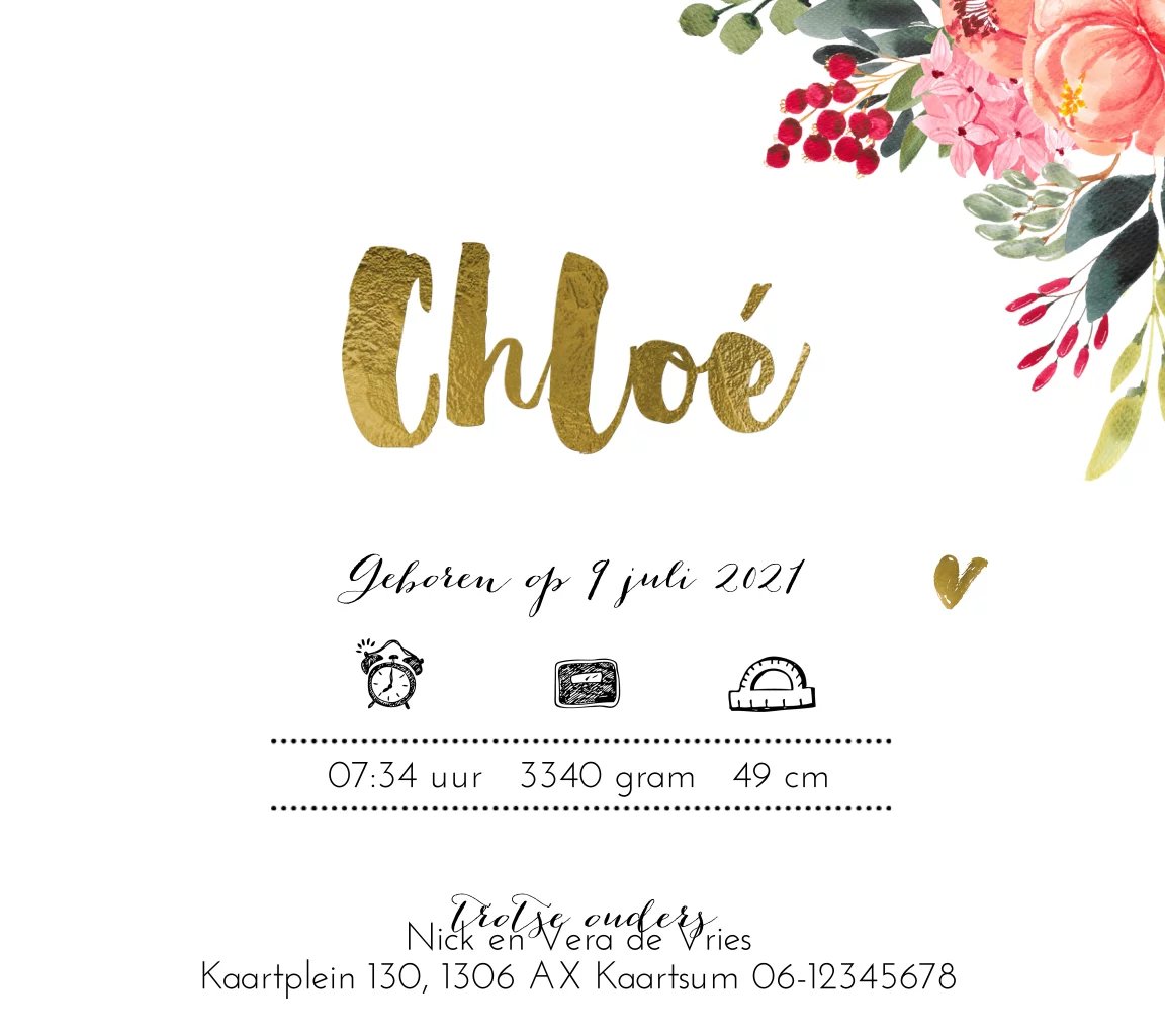 Uniek dubbel geboortekaartje voor een meisje in Belgisch vierkant! Met hippe watercolor bloemen, goudfolie naam en hartjes. Wil je de naam aangepast hebben in goudfolie look? Mail dan ons serviceteam!