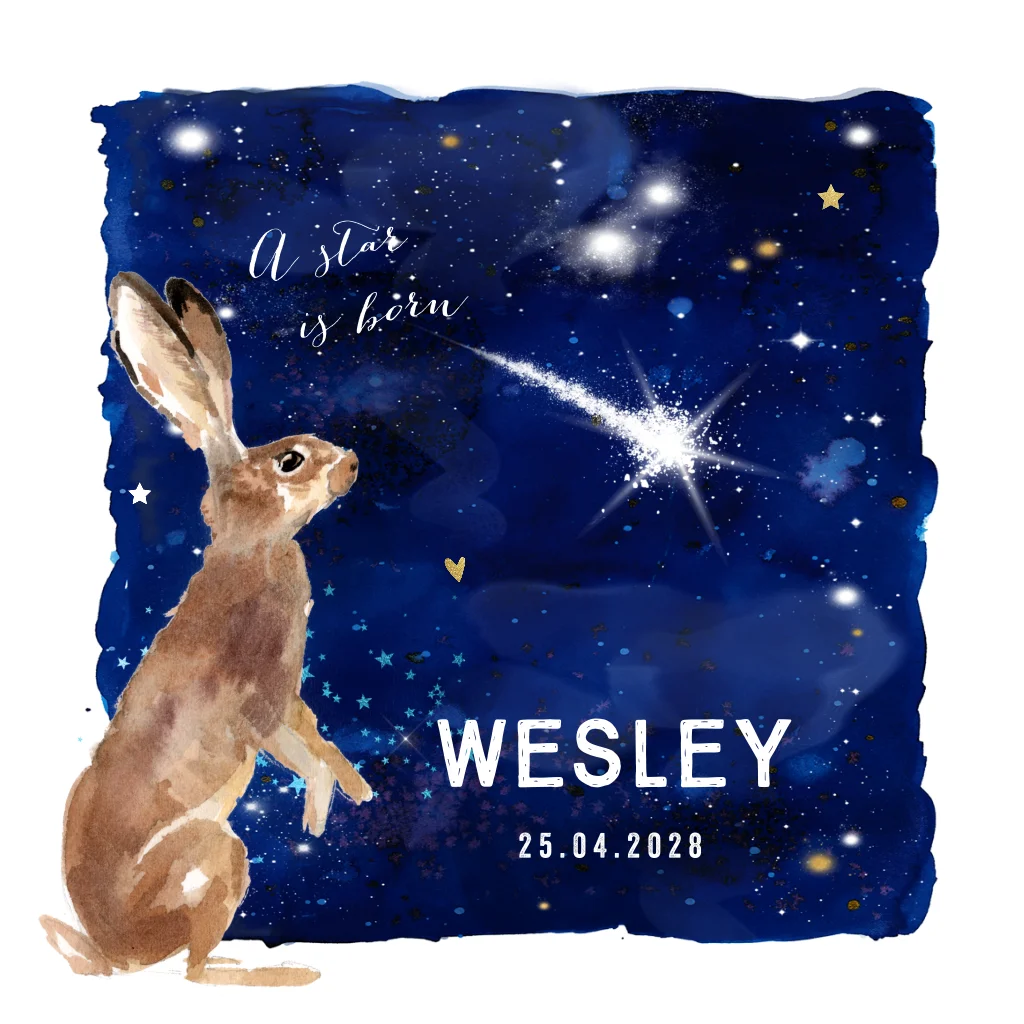 Lief getekend geboortekaartje jongen met haas en vallende ster