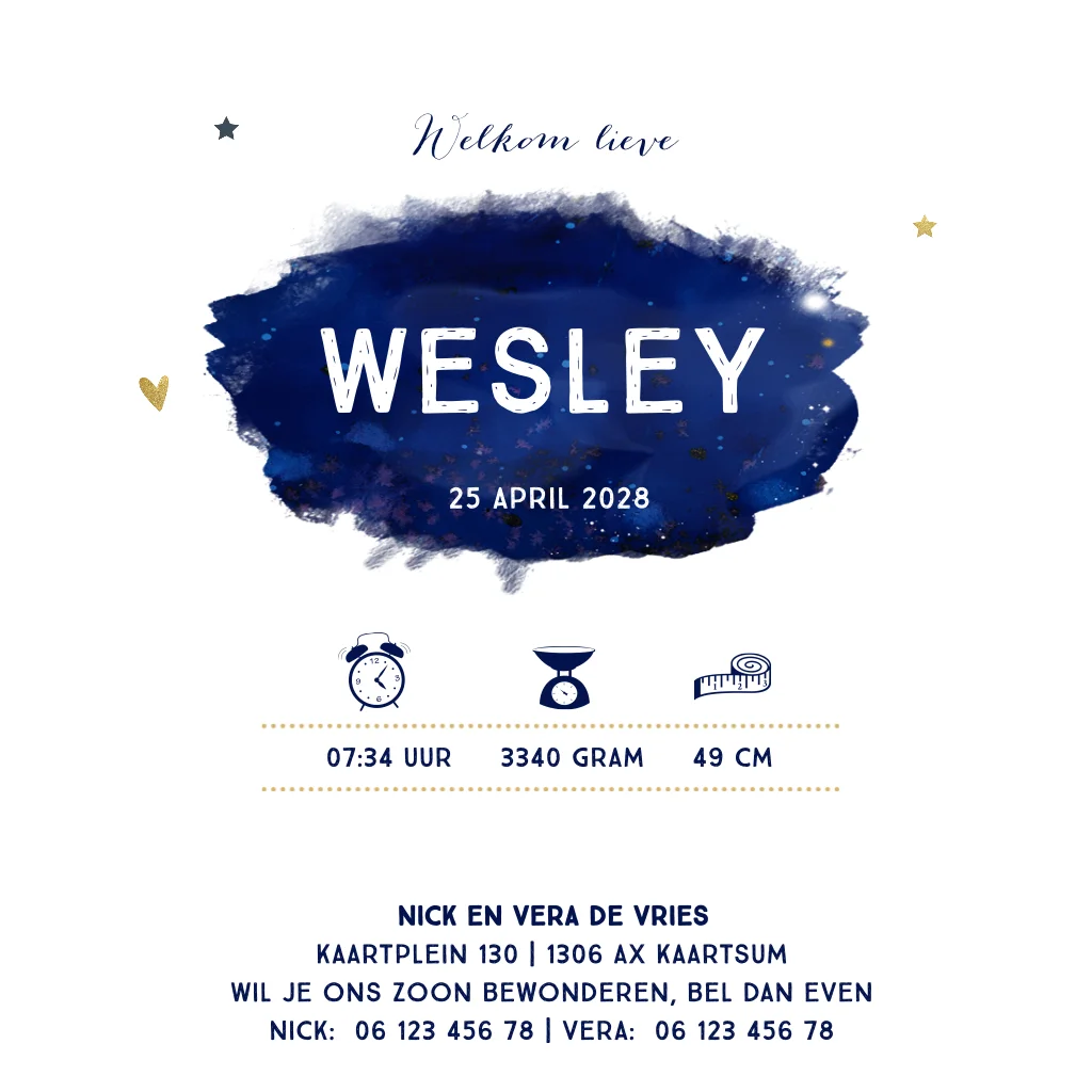 Lief geboortekaartje met thema a star is born! Voor een jongen met mooie donker blauwe illustratie ondergrond, vallende ster, haas en goud folie look hartjes en sterren, ladder van hout look. Zelf maken!