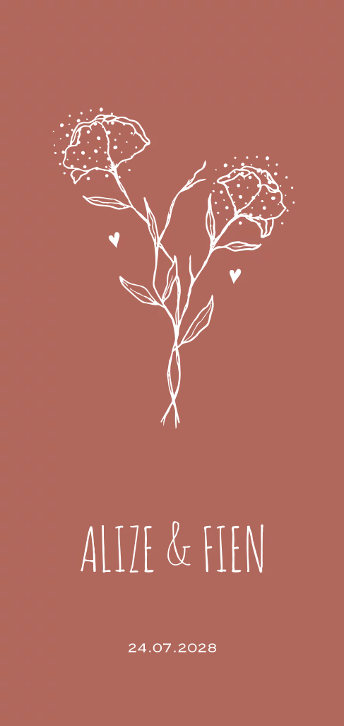 Langwerpig tweeling geboortekaartje voor meisjes met warme aardetinten, outline bloem en echt foliedruk.