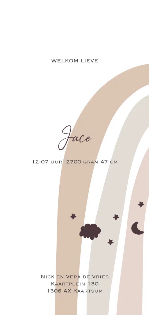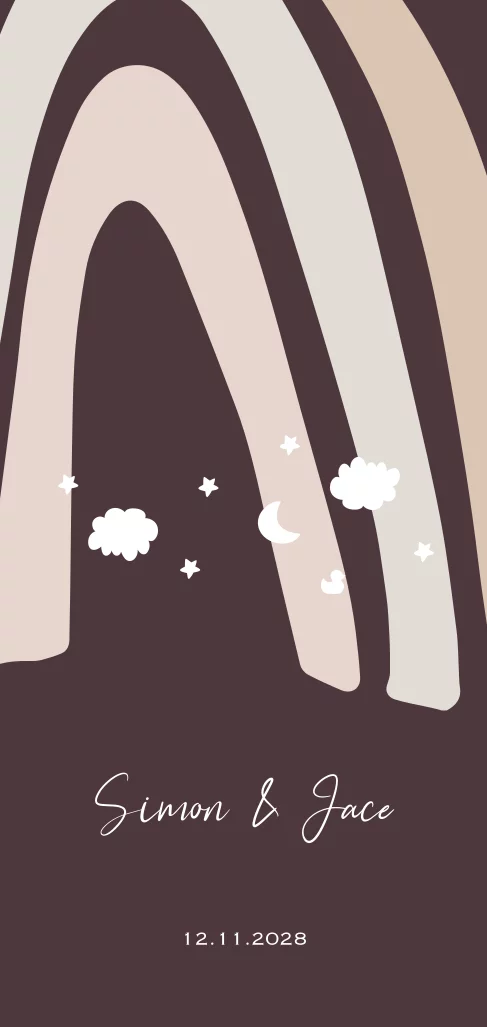 Dubbel langwerpig geboortekaartje voor een tweeling. Met aubergine kleur en regenboog in aardetinten. Alles is te bewerken.