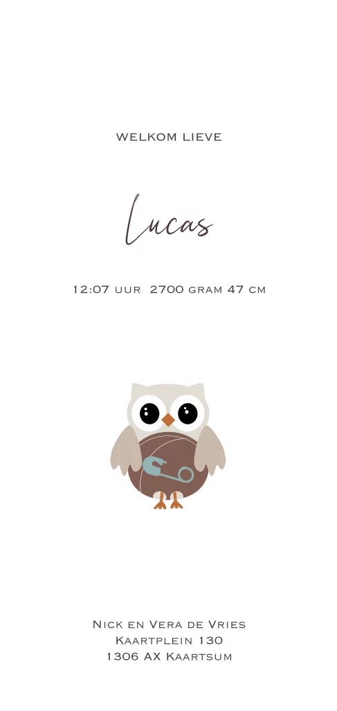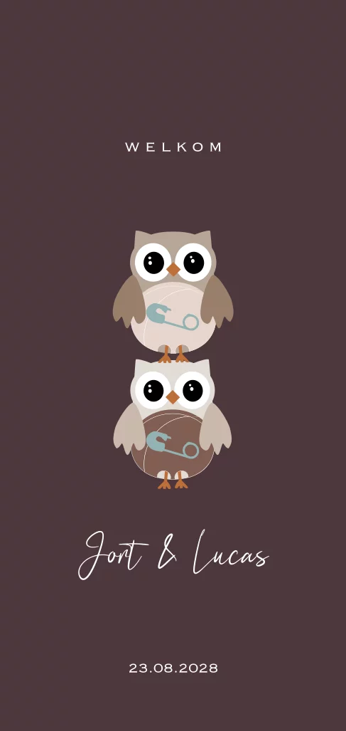 Dubbel langwerpig geboortekaartje voor een tweeling. Met aubergine kleur en lieve uiltjes in aardetinten. Alles is te bewerken.
