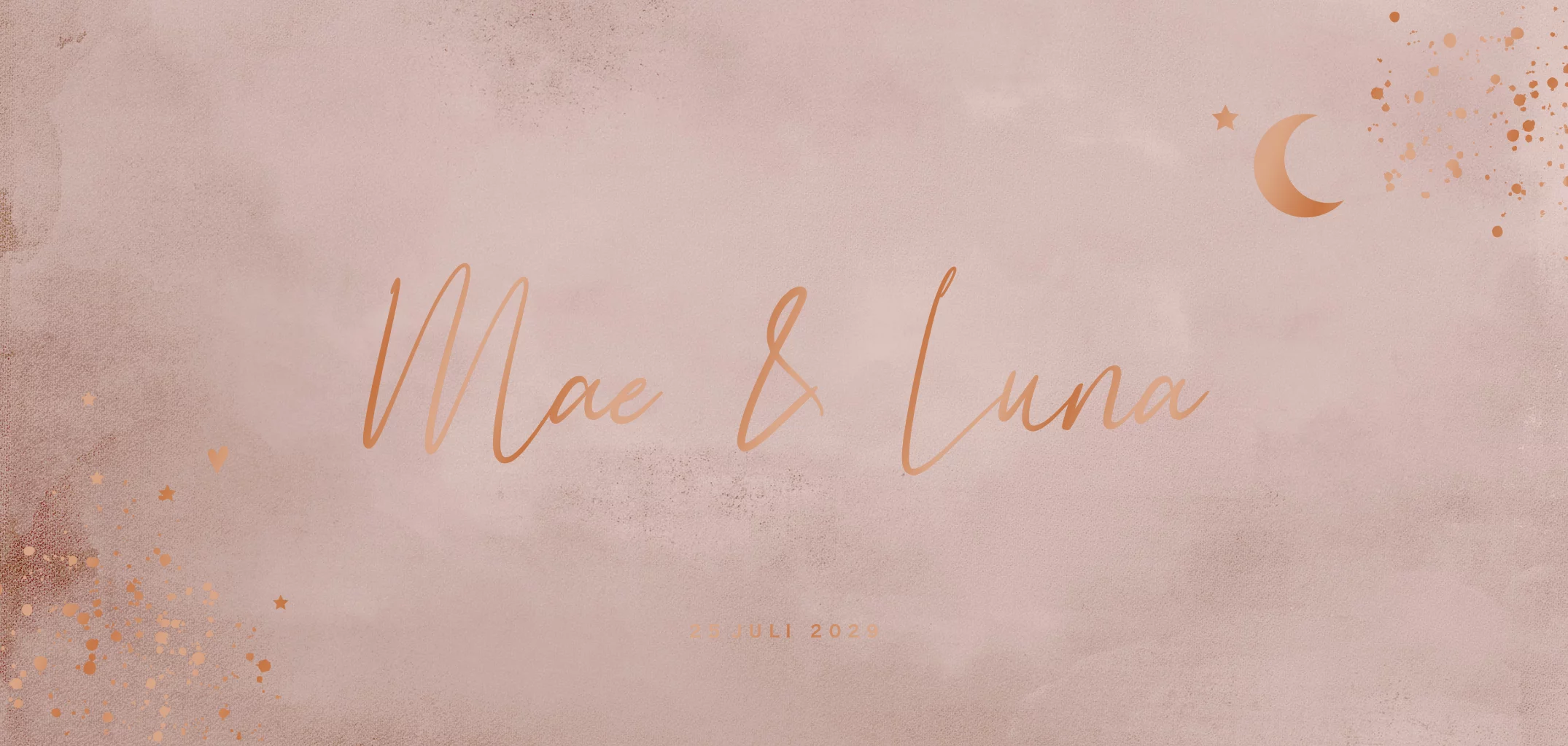 Super lief langwerpig geboortekaartje voor een tweeling meisje! Met zacht roze velvet look, spetters, maan en sterren. Alles staat los en is zelf te bewerken. Met foliedruk, zelf maken!