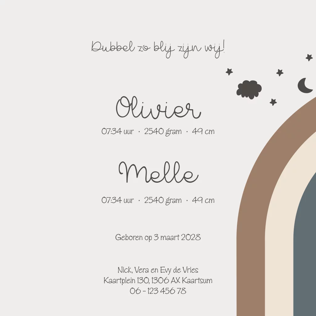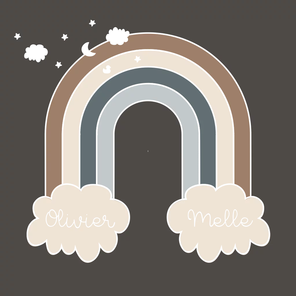Geboortekaartje voor een jongen. Prachtige regenboog met wolk in warme aardetinten en zwart foliedruk. De folie laag ligt bovenop, dus verschuif deze om bij de tekst te komen. De achtergrond kleur is aan te passen.
