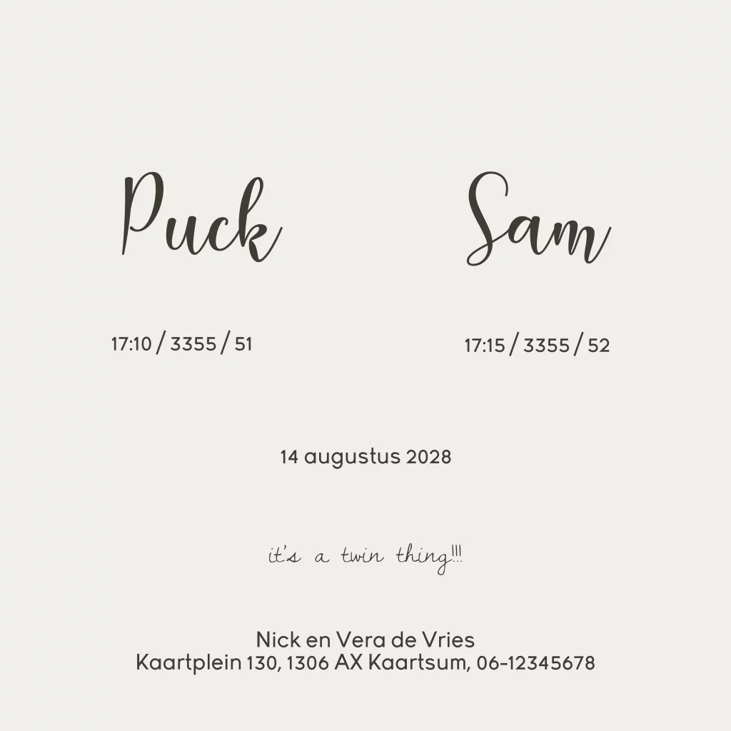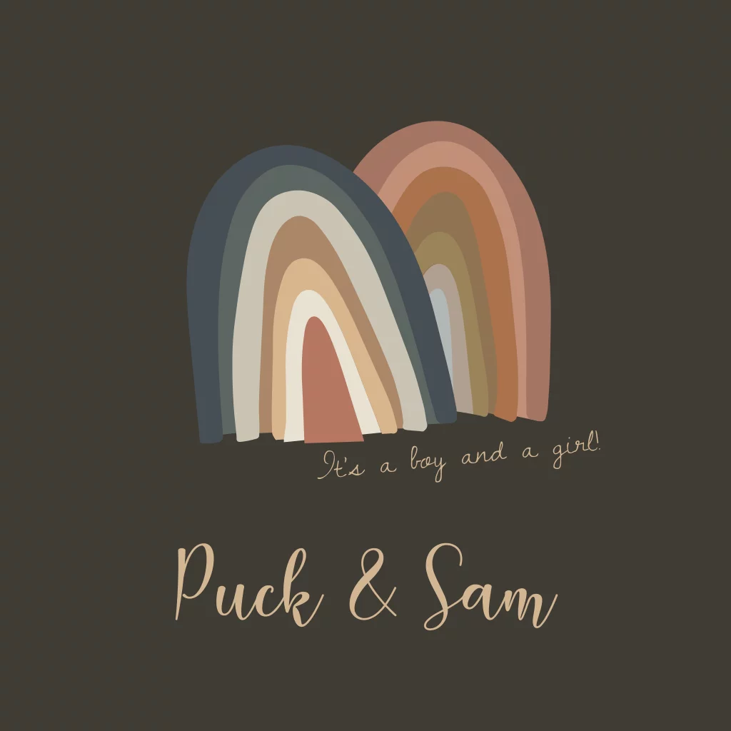 Lief geboortekaartje voor tweeling jongen en meisje met regenboog. Alles staat los en is aan te passen!