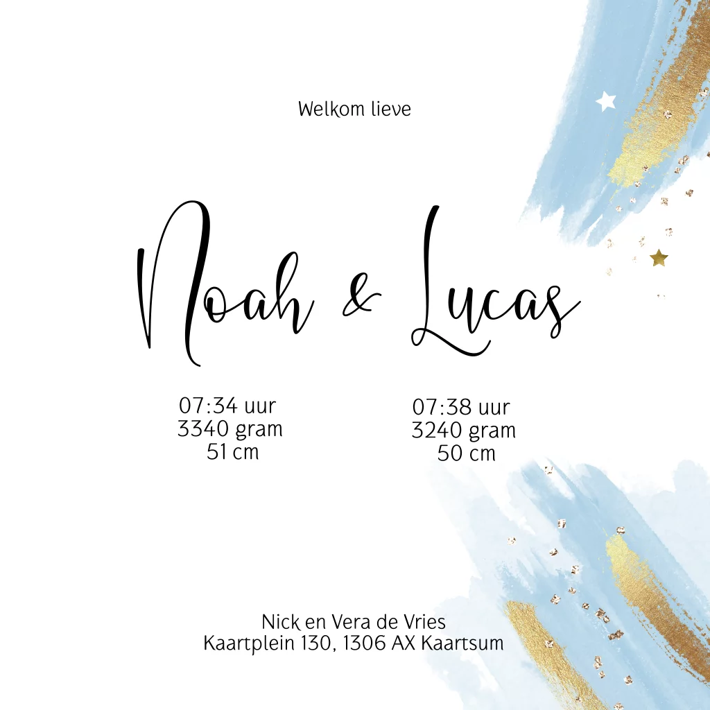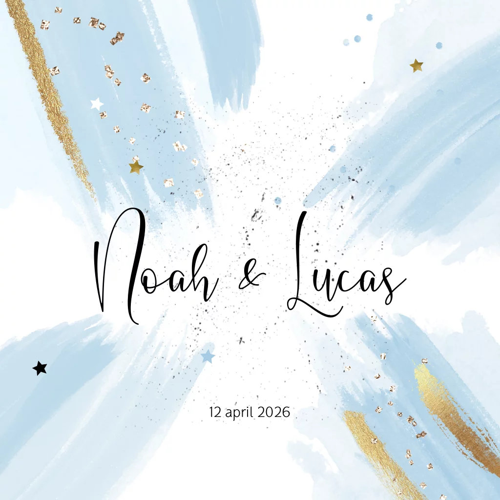 Uniek en explosief geboortekaartje voor een jongens tweeling met zacht blauwe aquarel, goud (look) verf penseel strepen, glitters, confetti, snippers en sterren. Zelf maken!