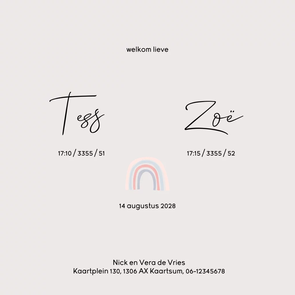Lief geboortekaartje voor tweeling zusjes met regenboog. Alles staat los en is aan te passen!