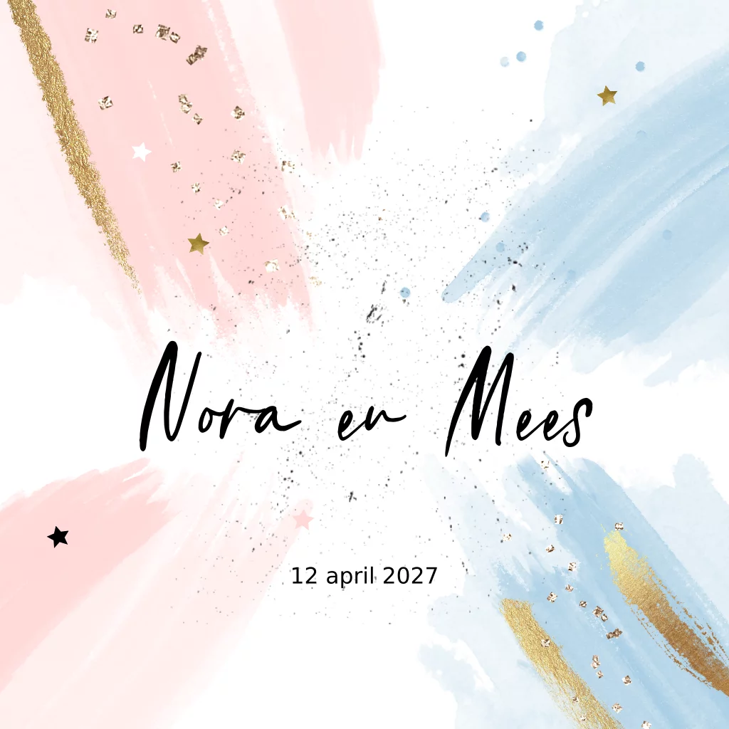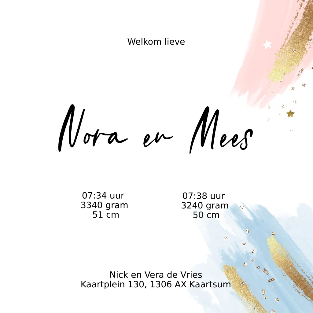 Uniek en explosief geboortekaartje voor een tweeling meisje en jongen met zacht roze en blauw aquarel, goud (look) verf penseel strepen, glitters, confetti snippers en sterren. Zelf maken!