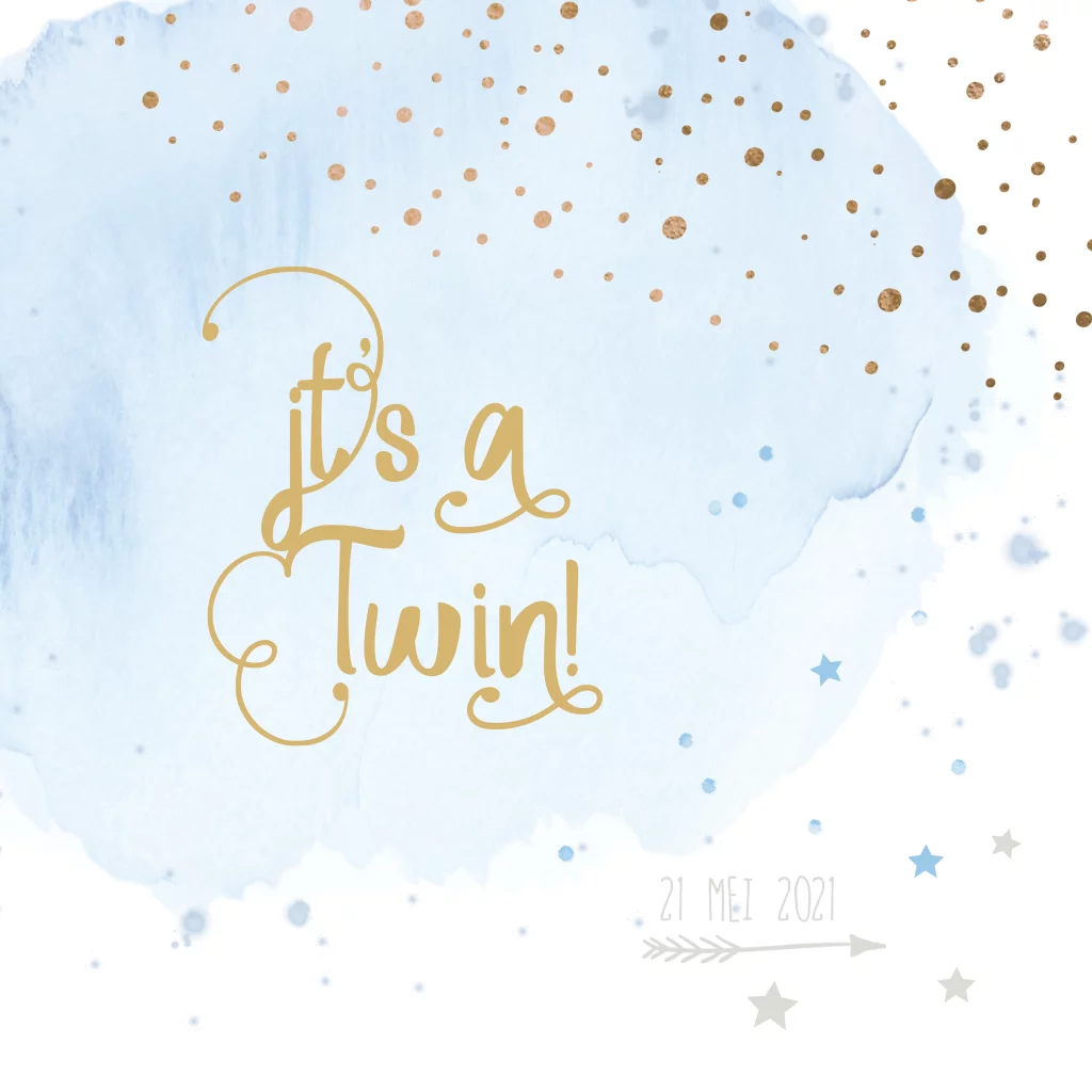 Snoozig geboortekaartje voor een jongens tweeling met babyblauwe watercolour, goud look, confetti snippers, sterren en pijltjes. Zelf maken!