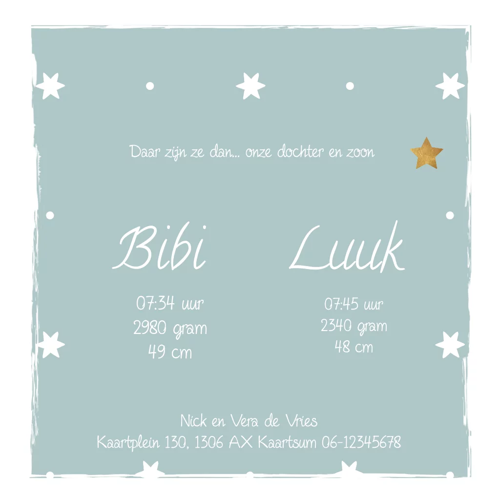 Lief geboortekaartje tweeling broer zus met sterretjes