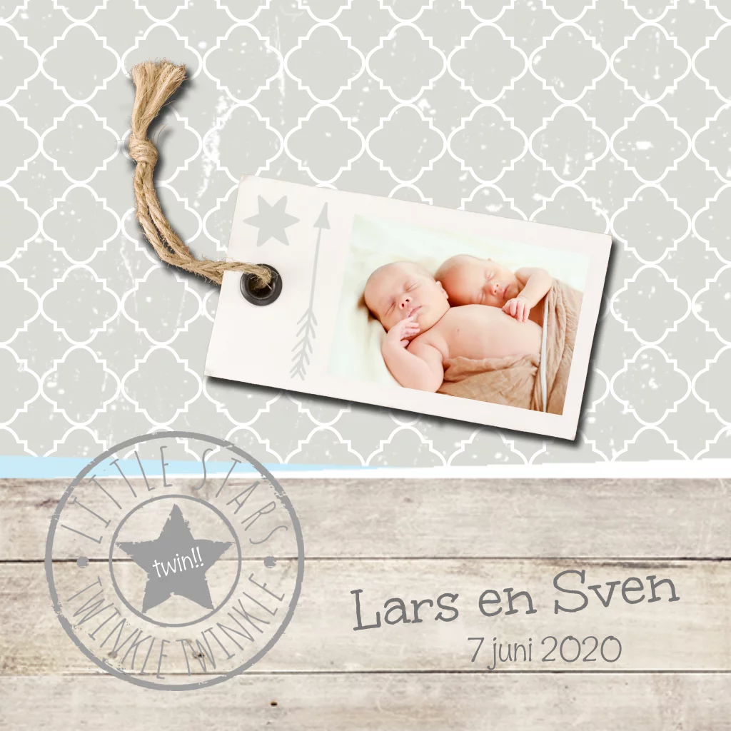 Geboortekaartje voor tweeling broers. Kaartje in pastel kleuren met bohemain en hout design. Foto label en stempel met twinkle twinkle. Alles staat los op dit kaartje en is aan te passen!