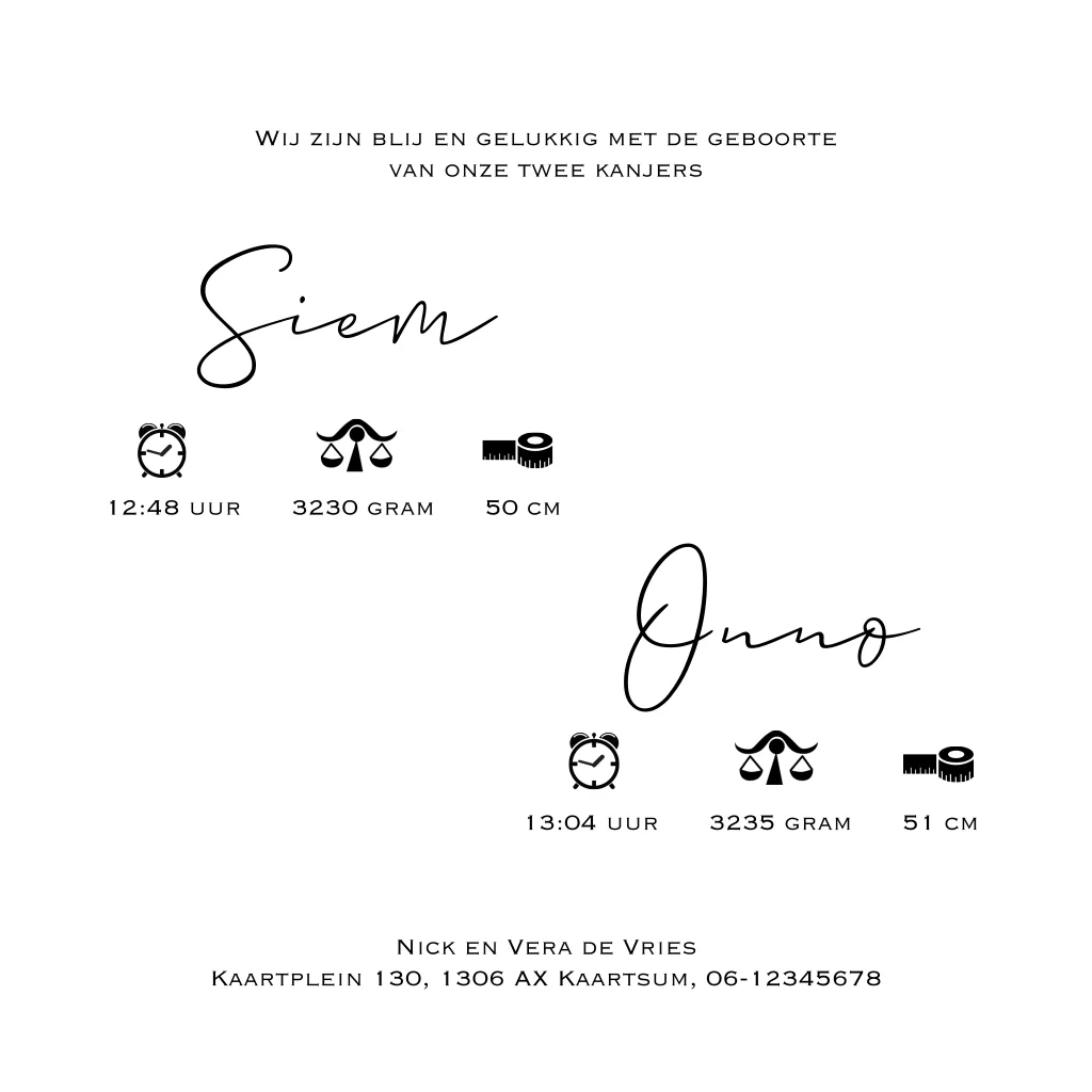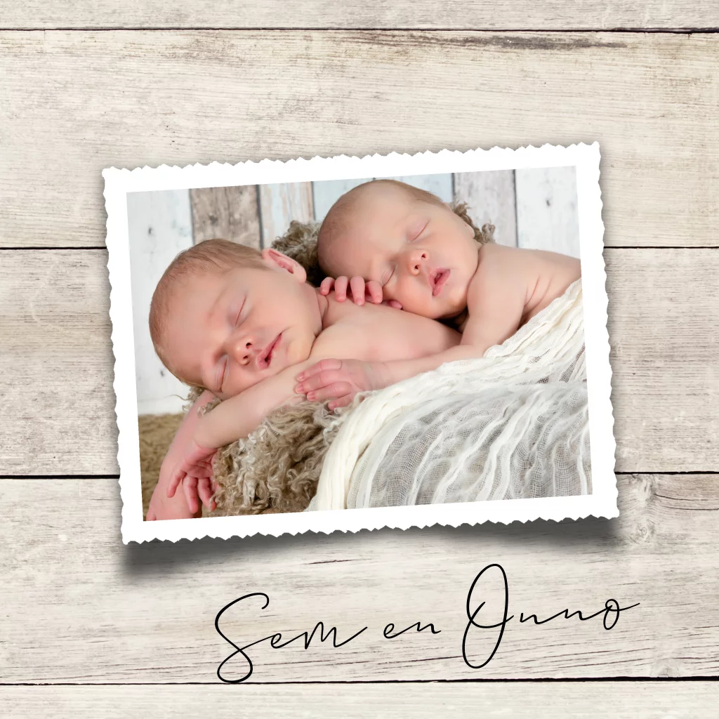 Foto twins geboortekaartje met stoere hout print en regenboog. Alles staat los en is aan te passen.