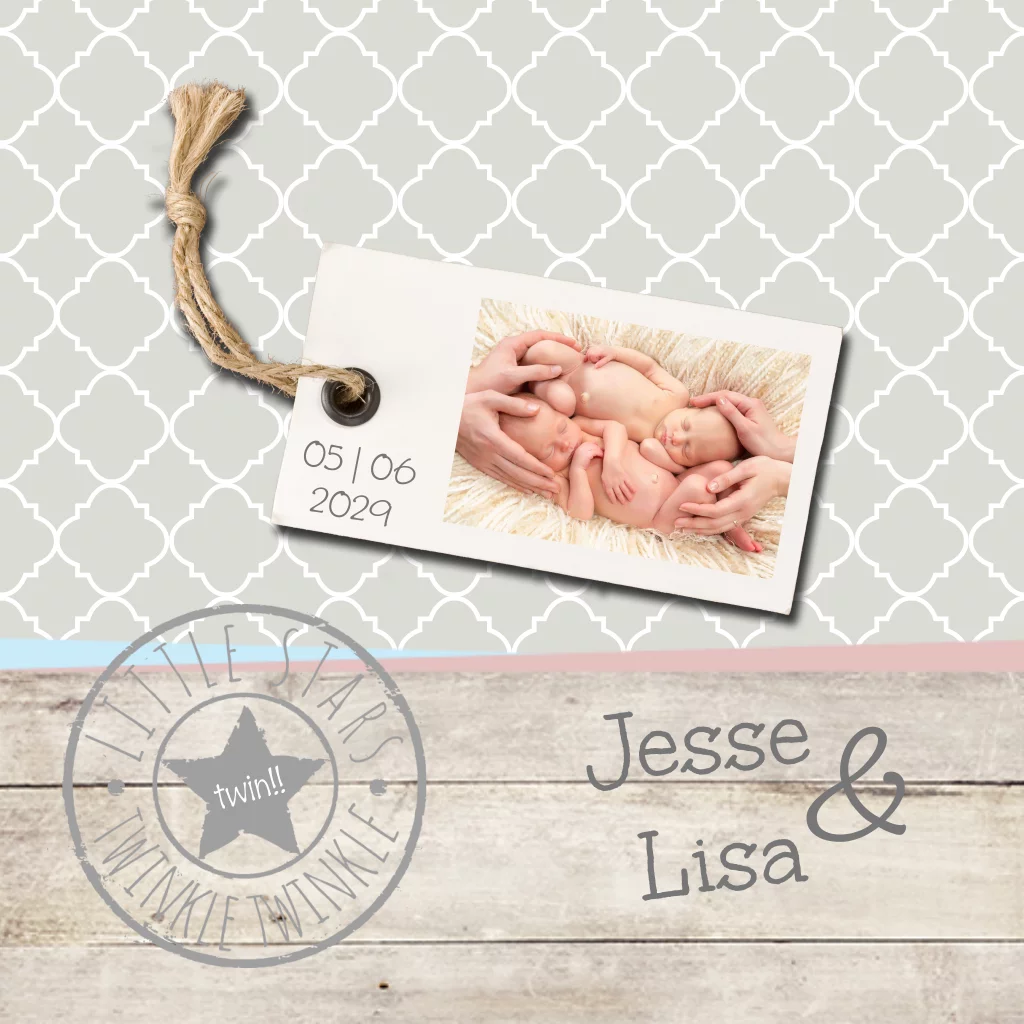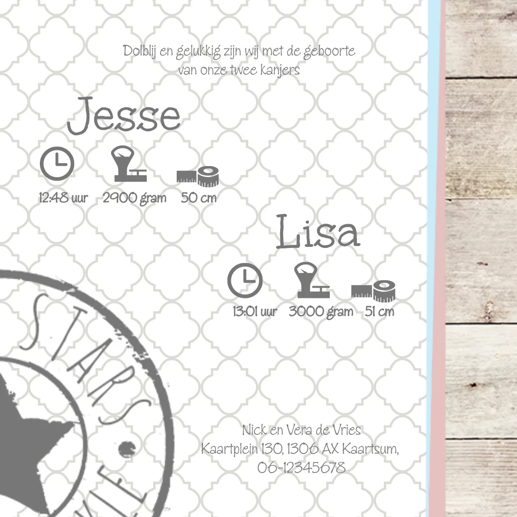 Geboortekaartje voor tweeling broer en zus. Kaartje in zachte pastel tinten met hout en bohemian design. Fotolabel voor eigen foto en hippe stempels. Alles staat los op dit kaartje en is aan te passen!