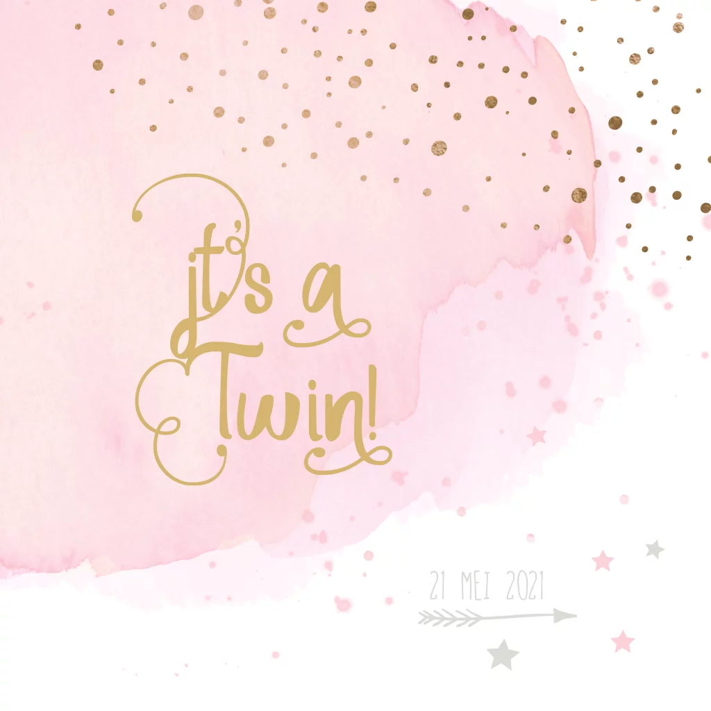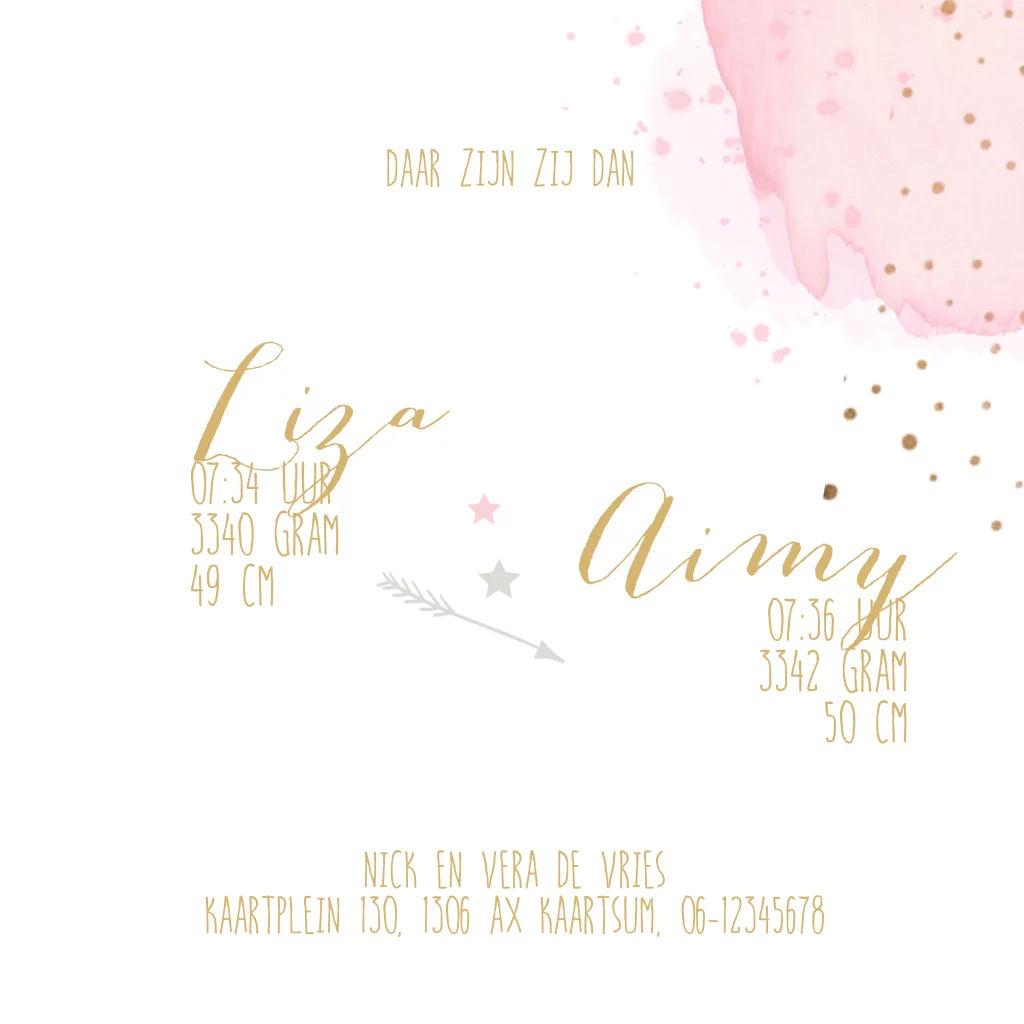 Snoozig geboortekaartje voor een meisjes tweeling met roze watercolour, goud look, confetti snippers, sterren en pijltjes. Zelf maken!