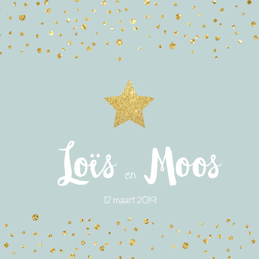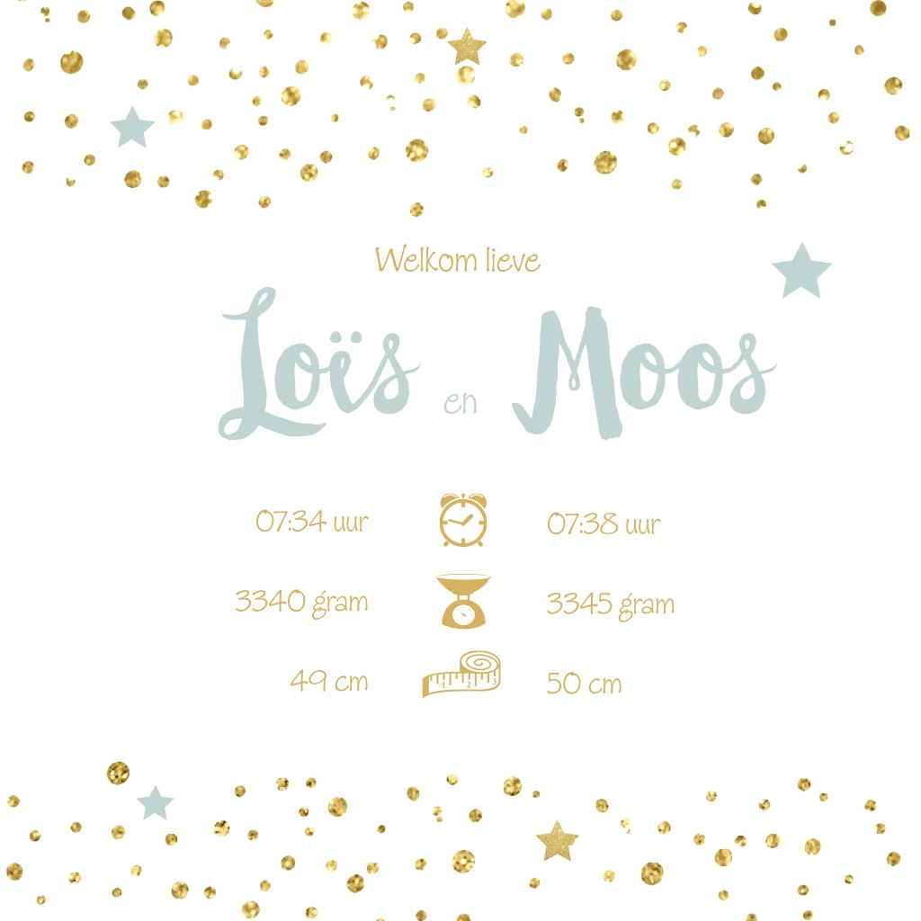 Chic geboortekaartje met een goud look? Voor een tweeling met mint groene ondergrond en confetti in goud look. Alles staat los op dit kaartje en is aan te passen!
