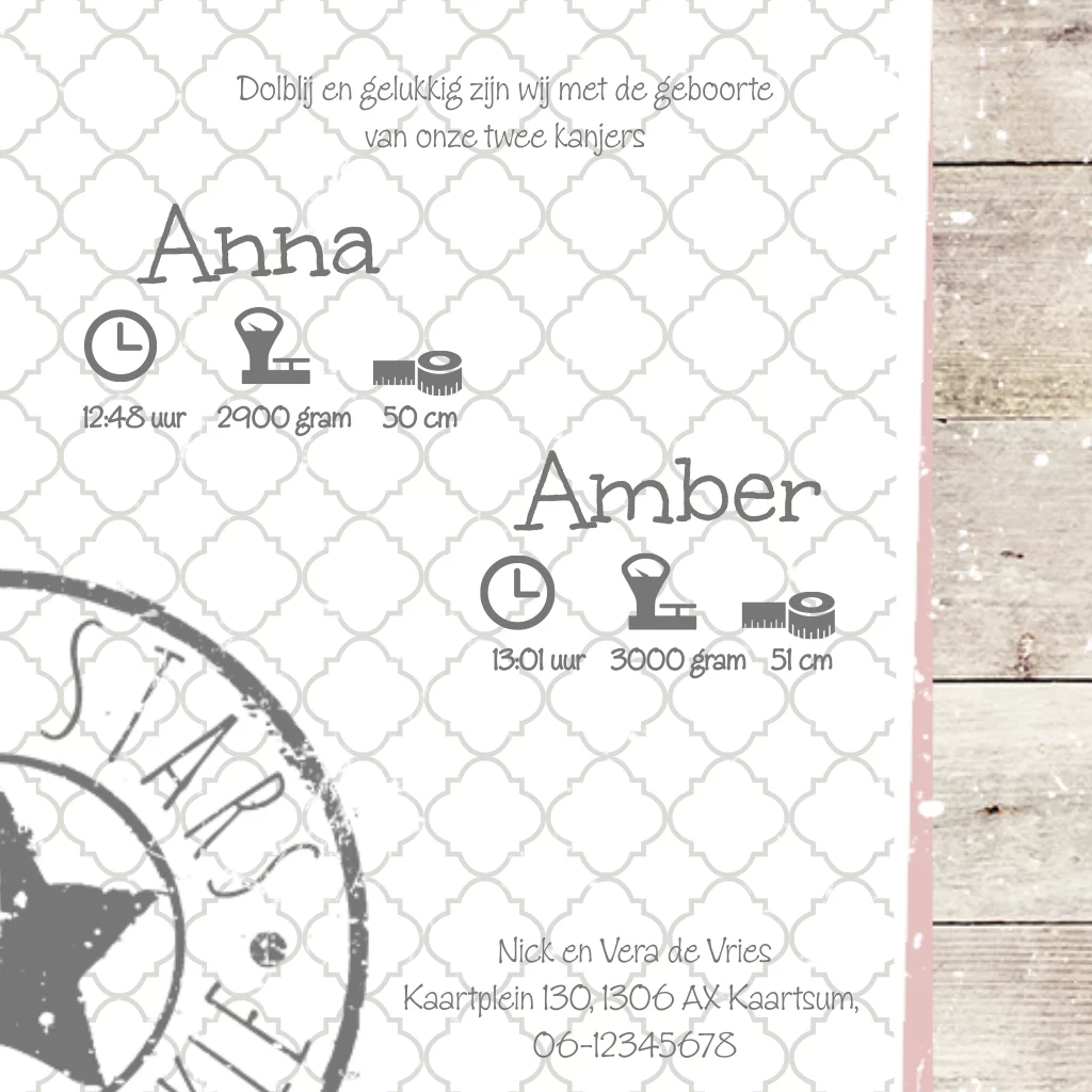 Geboortekaartje voor tweeling zusjes. Kaartje in zachte kleuren met, stempel twinkle, bohemian en hout design. Met foto label voor eigen foto en stempels. Alles staat los op dit kaartje en is aan te passen!