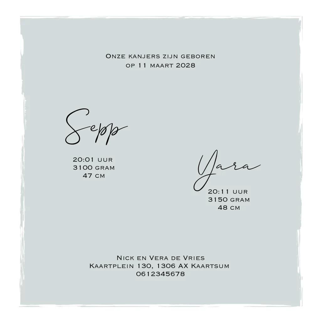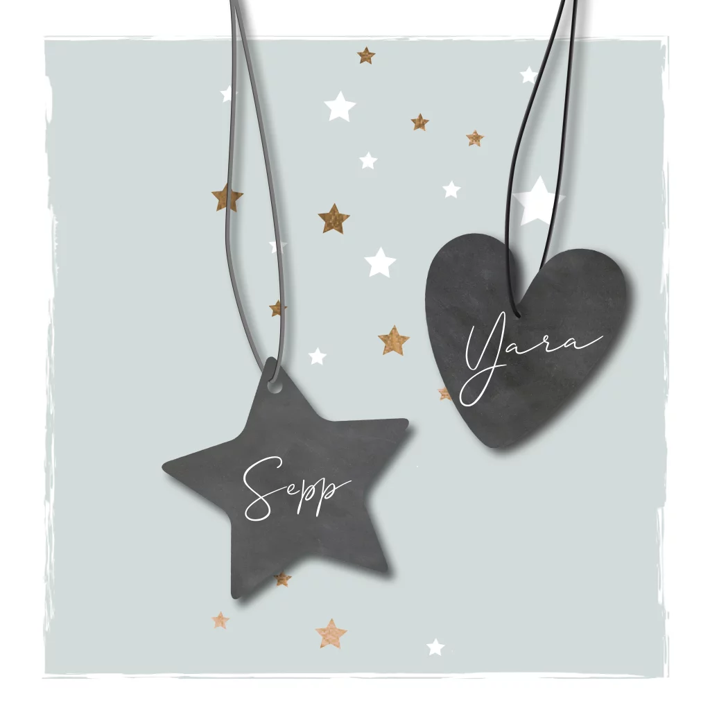 Super lief mint groen geboortekaartje voor een tweeling met krijtbord hanger en koperen sterren. Alles staat los op dit kaartje en is aan te passen!