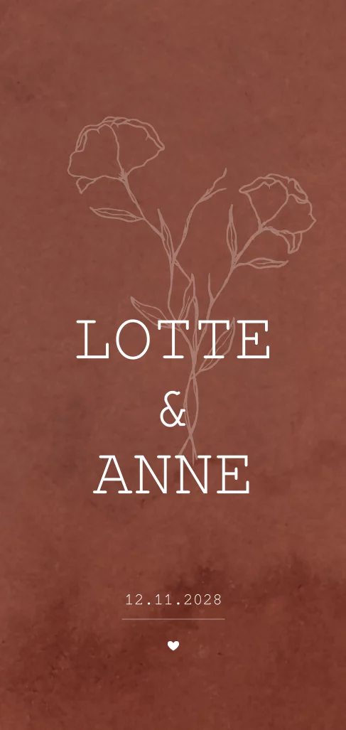 Stijlvolle tweeling geboortekaartje compleet met voorbeeld tekst die je geheel zelf kunt aanpassen. Je kunt gebruik maken van verschillende lettertypes. De terracotta kleur geeft de kaart een warme uitstraling. De lijngetekende takjes en bloemen geven een chique uitstraling. In onze beeldbank vind je nog meer lijn bloemen die je kunt toevoegen. Deze kaart kun je zelf online maken.