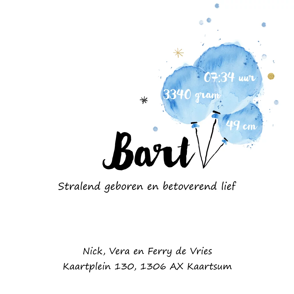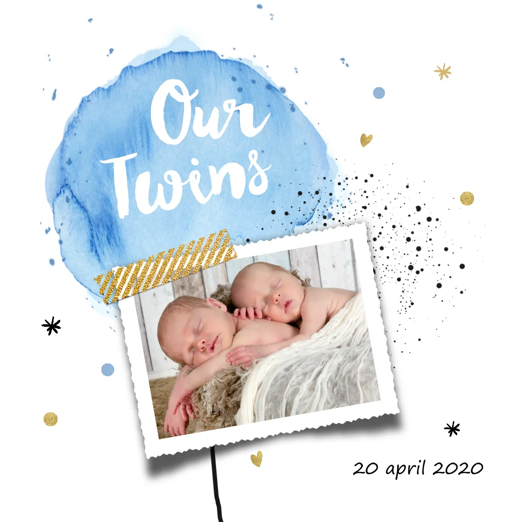 Schattig geboortekaartje voor tweeling broertjes in waterverf look. Versierd met ballonnen, confetti, hartjes, sterren en eigen foto.