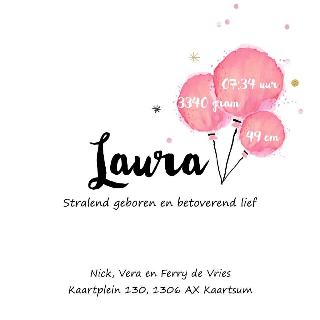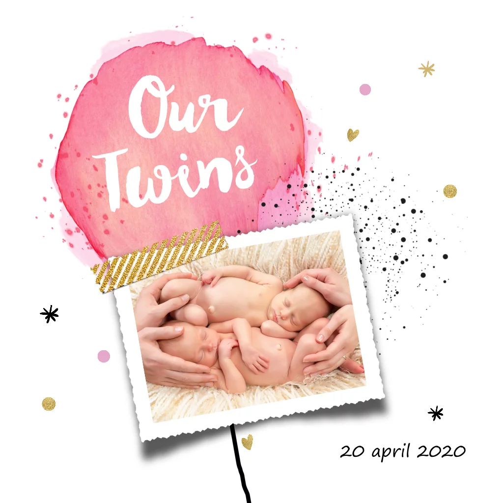 Schattig geboortekaartje voor tweeling zusjes in waterverf look. Versierd met ballonnen, confetti, hartjes, sterren en eigen foto.