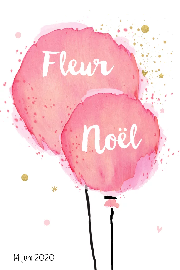 Uniek enkel geboortekaartje voor tweeling zusjes? Met groot getekende watercolor ballon op de voorzijde in en pastel roze tint, goud glamour kleurige sterren en hartjes. Alles staat los op dit kaartje en is aan te passen!