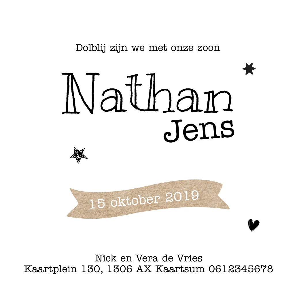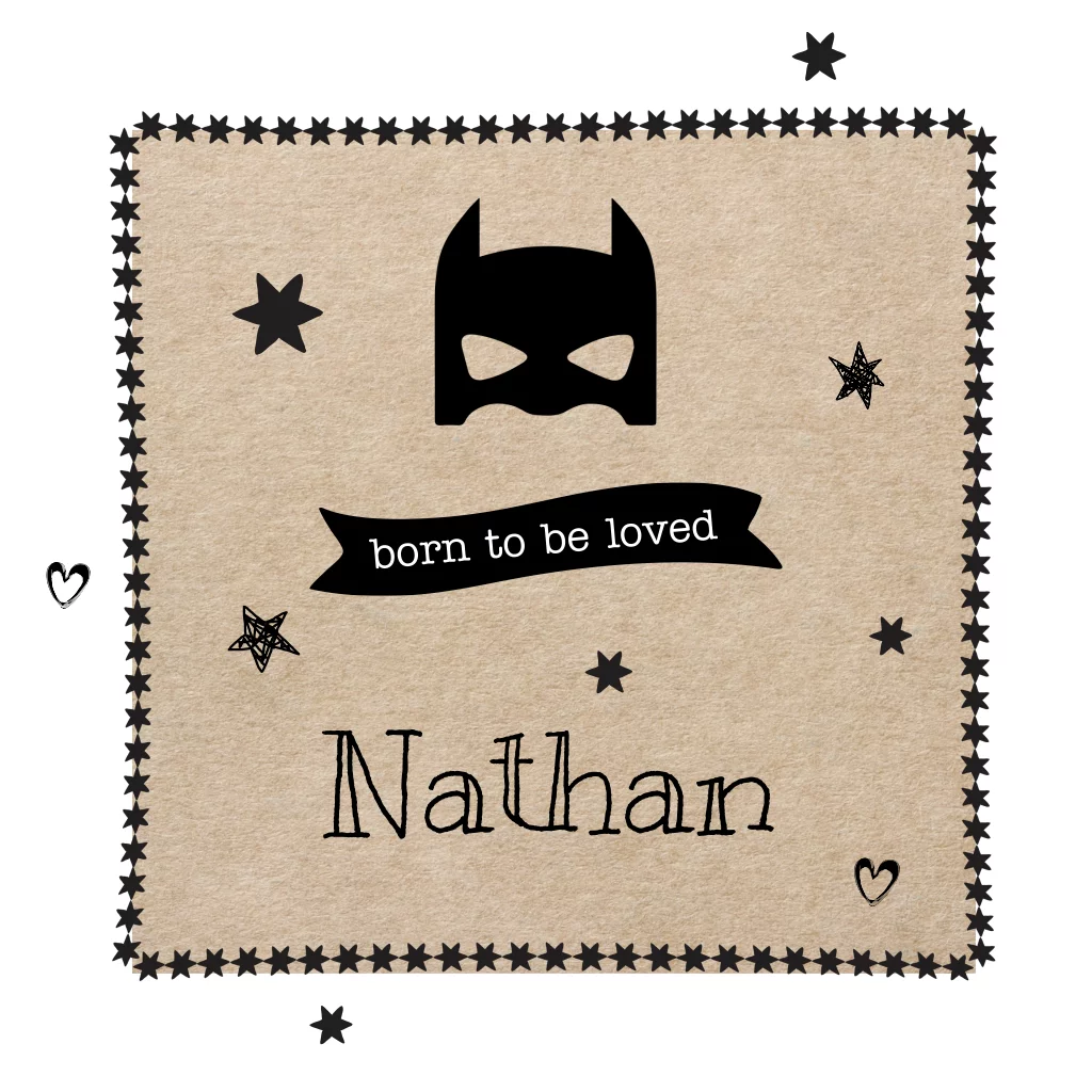 Modern zwart wit geboortekaartje voor een jongen? Met badman masker, kraft print, speelse sterretjes en een kader van sterren rondom. Alles staat los op dit kaartje en is aan te passen!