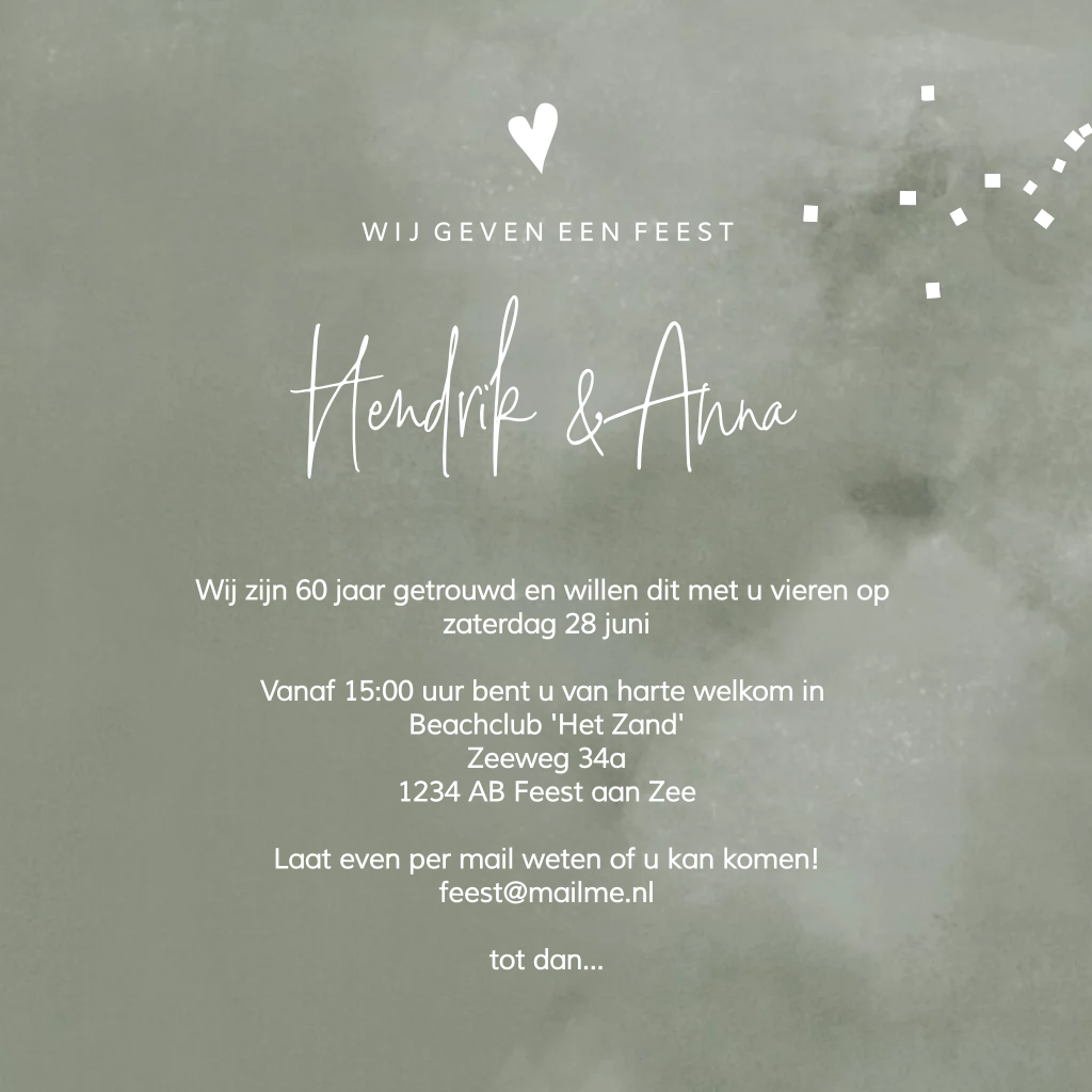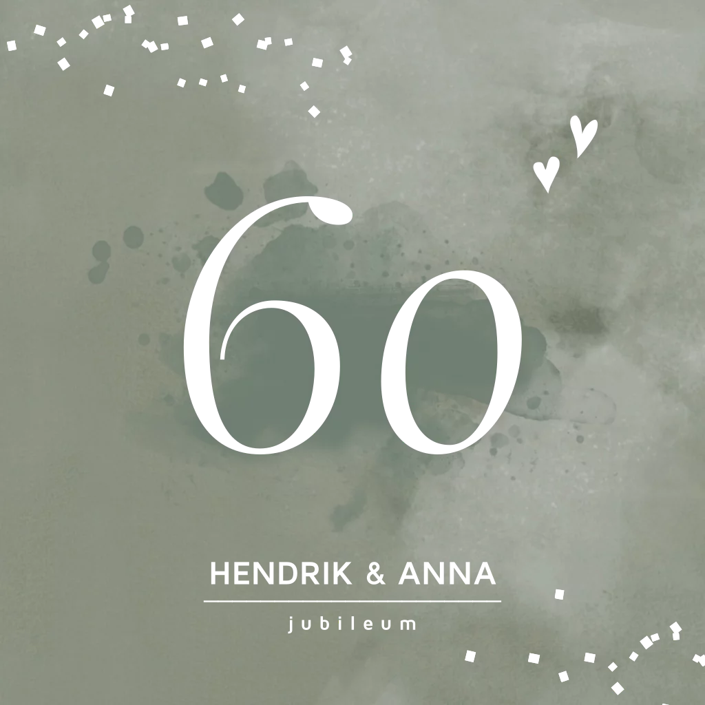 Eerdaags jullie 60 jarig huwelijks jubileum feest geven? Mooie uitnodiging met écht goudfolie druk. Achtergrond een mintgroene watercolor. Versierd met spetters van goudfolie. Binnenzijde 2 fotokaders voor het plaatsen van eigen foto's.