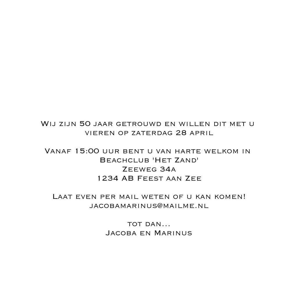 Eerdaags jullie 50 jarig huwelijksjubileum feest geven? Mooie uitnodiging met écht goudfolie, 2 fotokaders, vogeltje en handlettering.